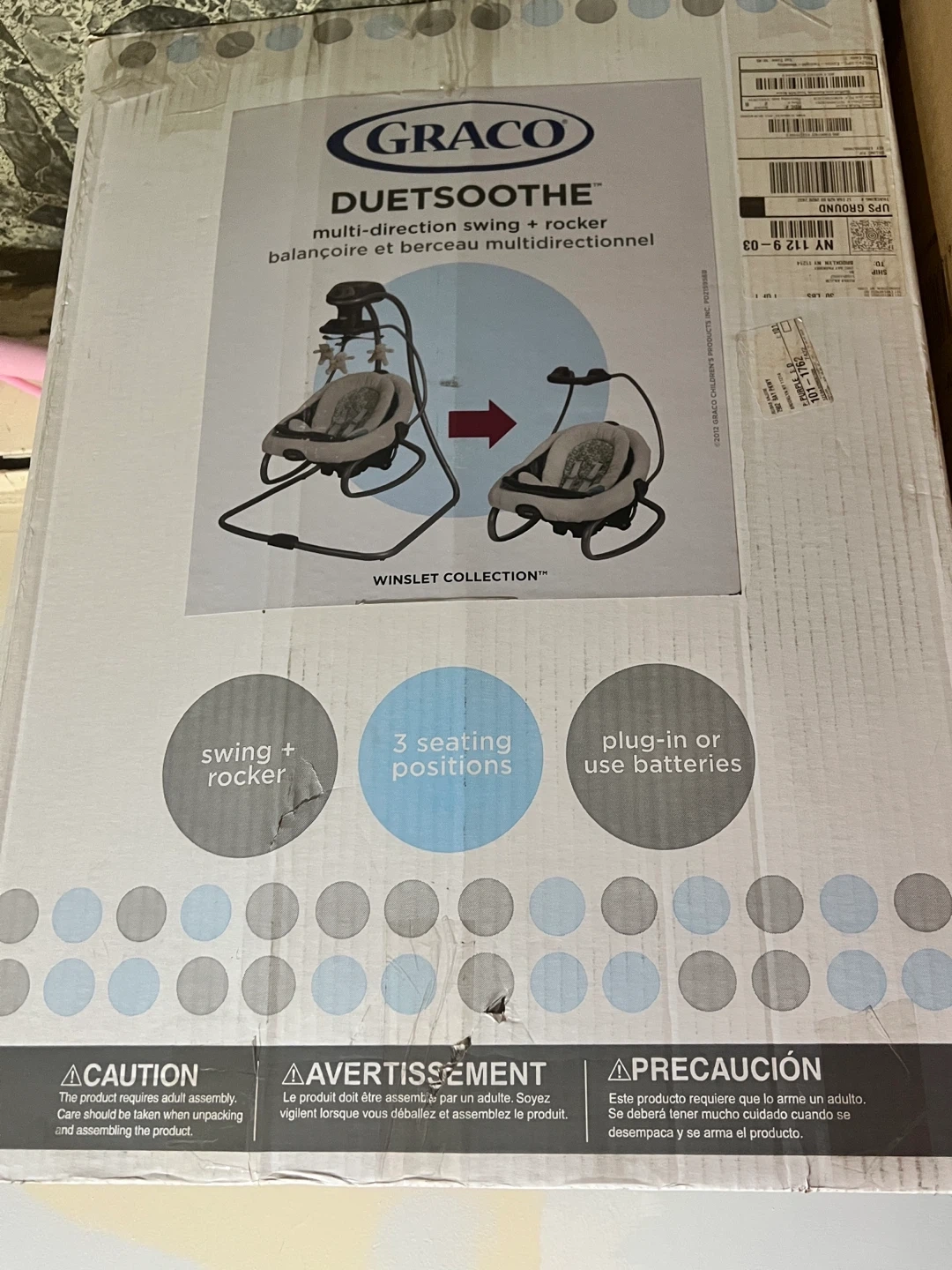 32Selling a Graco DuetSoothe multi-direction swing and rocker! It's from the Winslet Collection and has 3 seating positions. It can be plugged-in or use batteries. The box includes caution and warning labels for adult assembly.