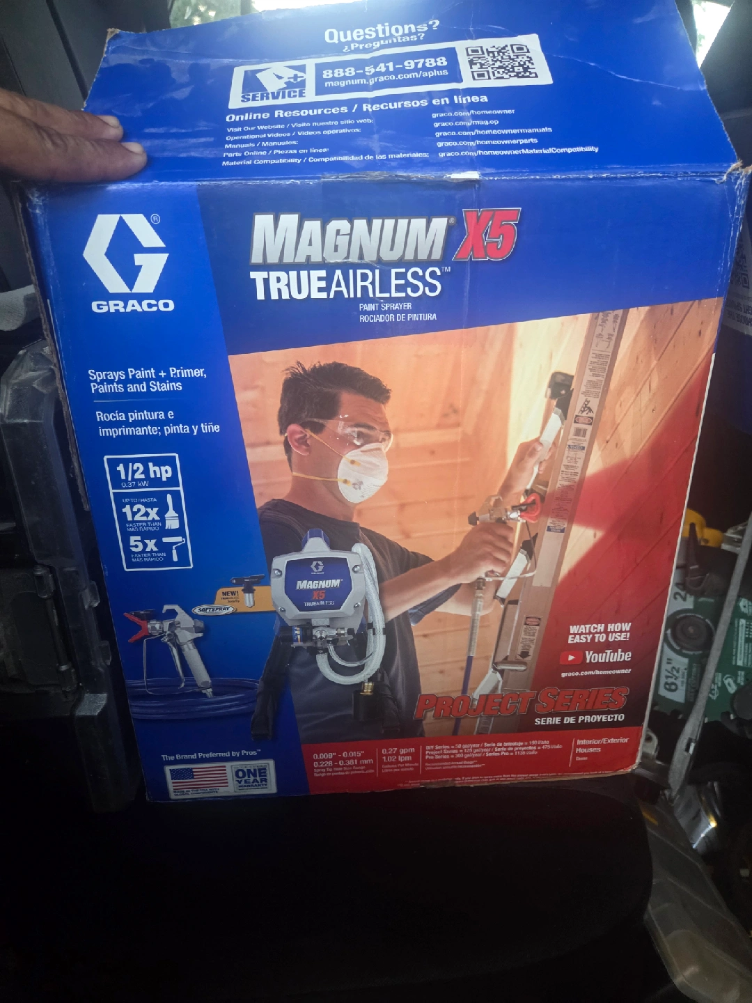 Selling a Graco Magnum X5 TrueAirless paint sprayer in its original box! This sprayer is perfect for DIY projects and handles paint, primer, and stains. It sprays up to 0.27 gallons per minute and supports tip sizes from 0.009" to 0.015". It's the brand preferred by pros!