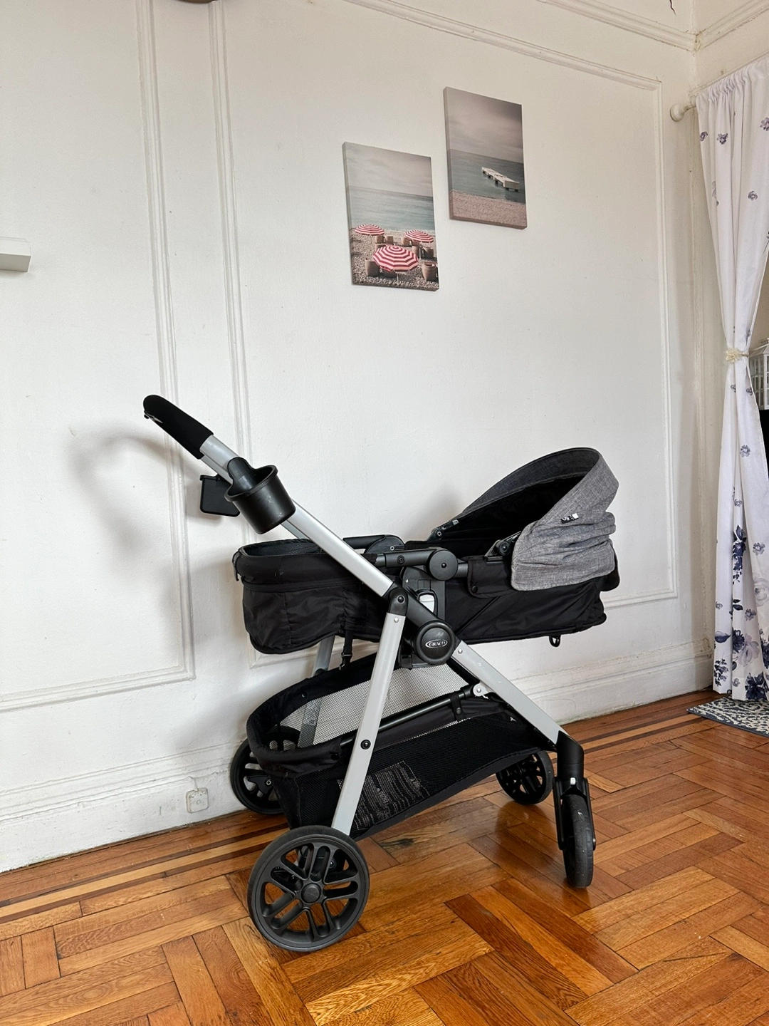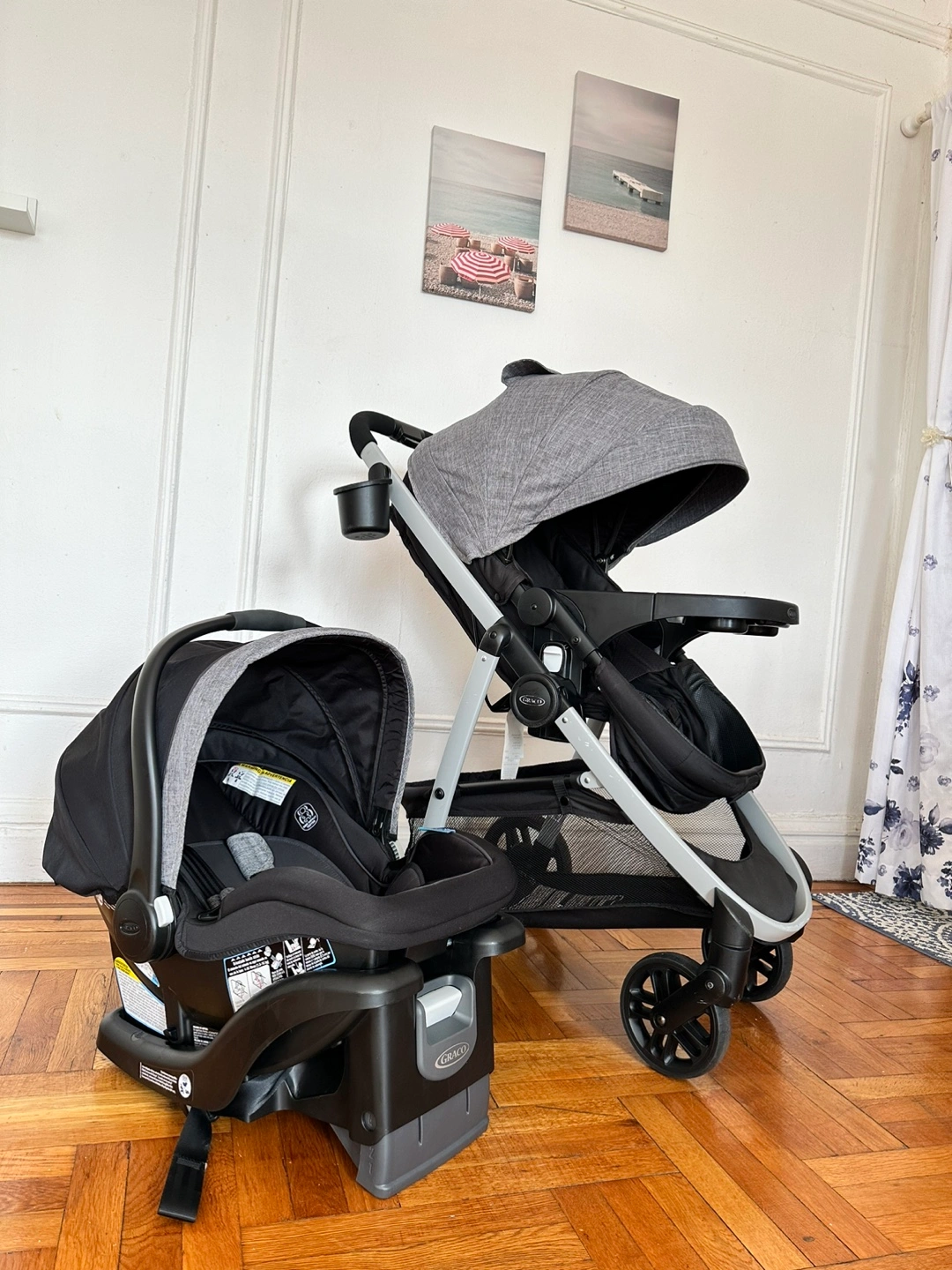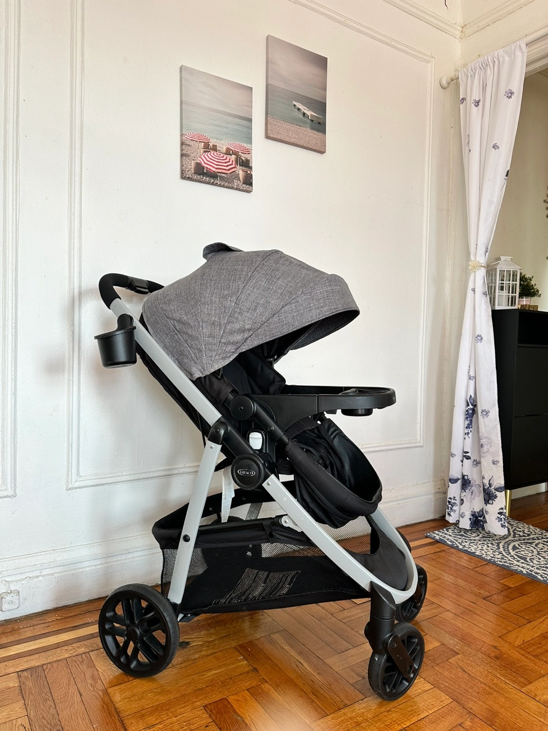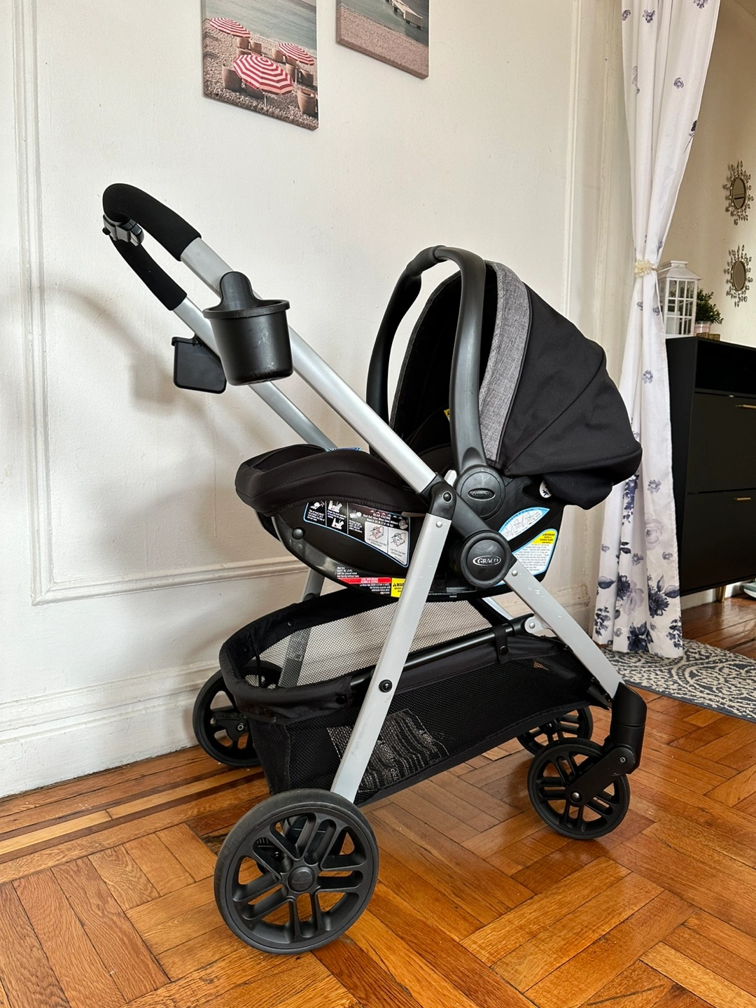 Lightweight stroller with car seat. Gray and black fabric. Includes cup holder and storage basket. Easy to fold.
