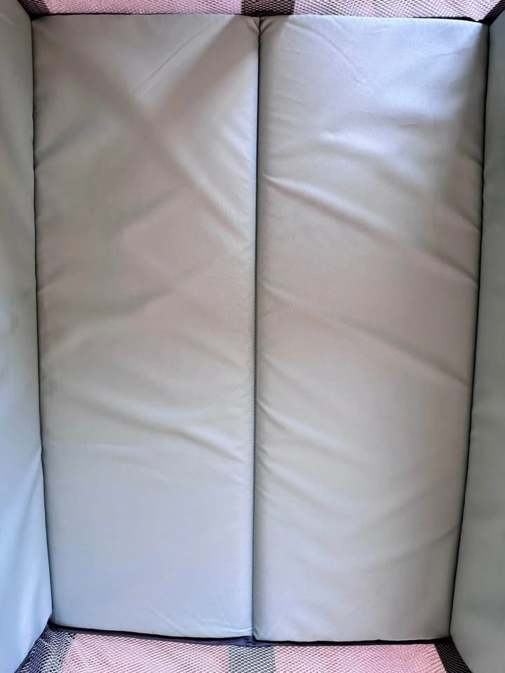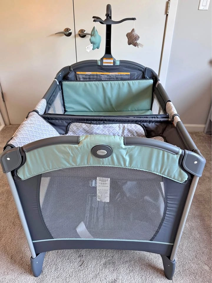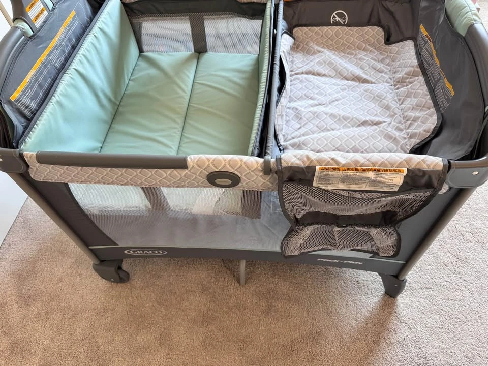 Graco Pack ’n Play Change ’n Carry Playard • Model No.: 1893893 • Manufacture Date: August 30, 2022 • Purchase Date: July 22, 2023 • Color: Manor • Includes: Portable changing pad • Dimensions: 40” x 28.5” x 29” • Weight: 23 lbs Note: There are some stains on the mattress. A replacement mattress is available on Graco’s website for $21.
