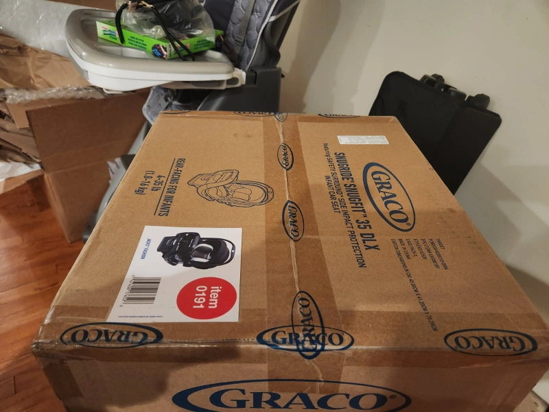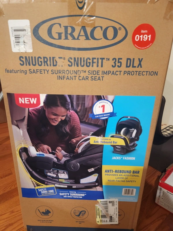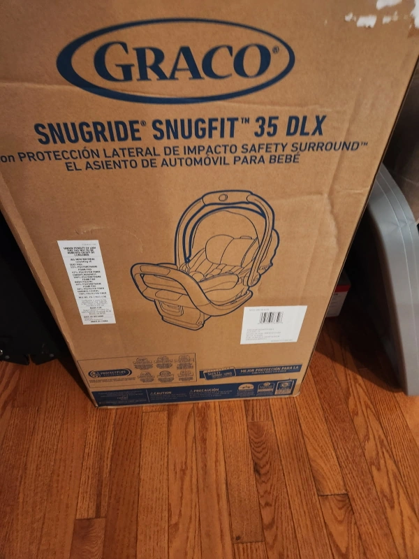Selling a brand new Graco SnugRide SnugFit 35 DLX infant car seat - has original greco taping! It features Safety Surround side impact protection and an anti-rebound bar for rear-facing safety. It's designed for infants rear-facing from 4-35 lbs (1.8-16 kg) and up to 32 inches (81.3 cm).