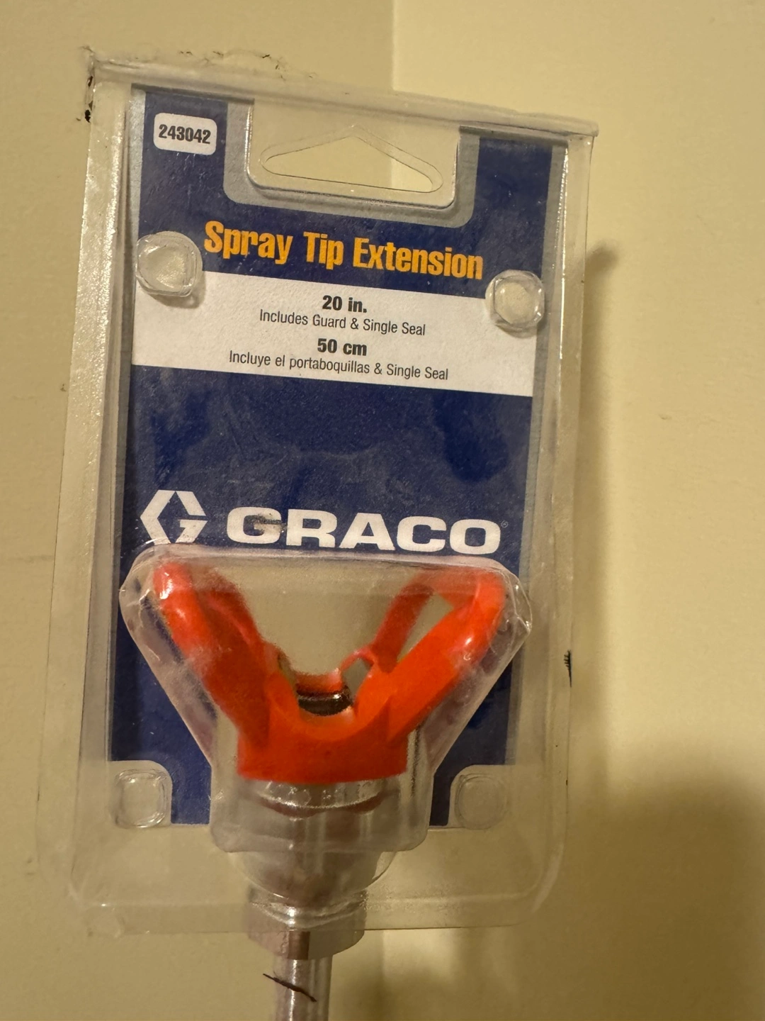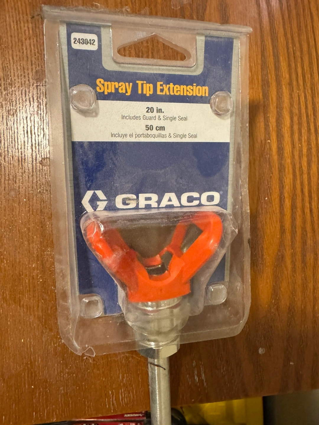 I'm selling a brand new Graco Spray Tip Extension! It's 20 inches and includes a guard and single seal. It also measures 50 cm. Securely tighten the extension to the gun with a wrench