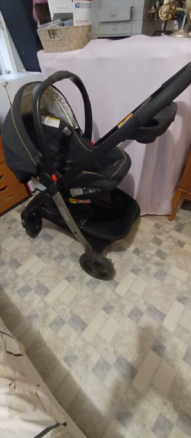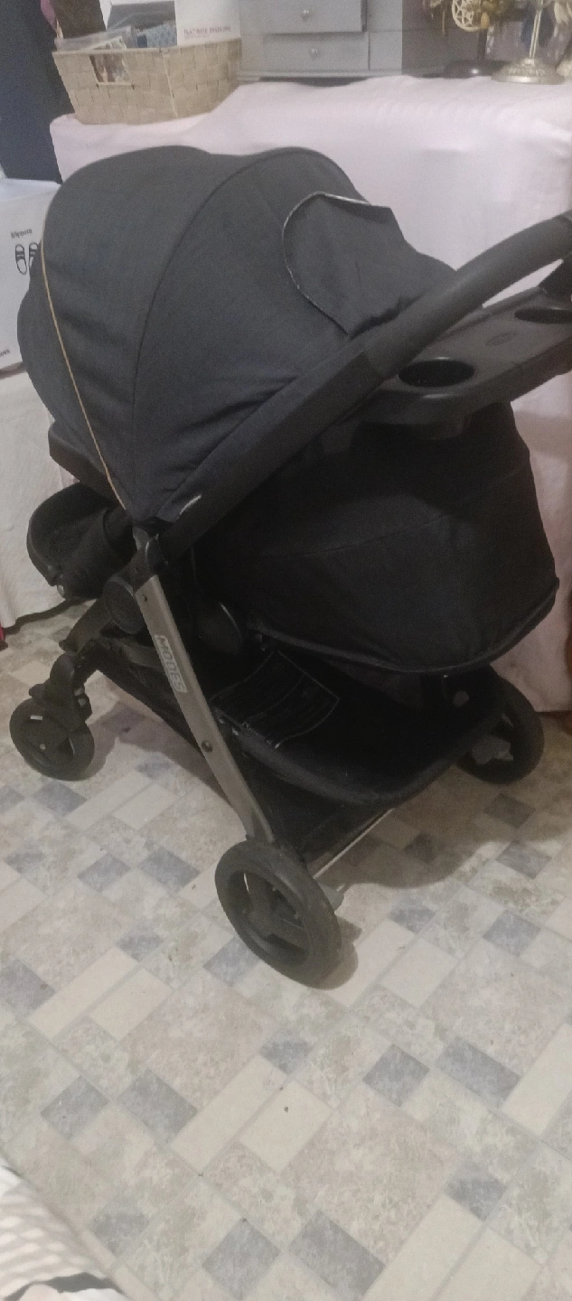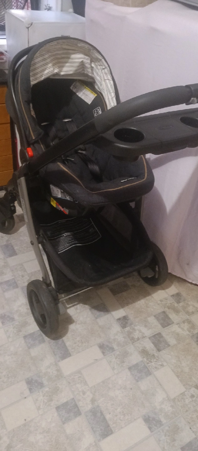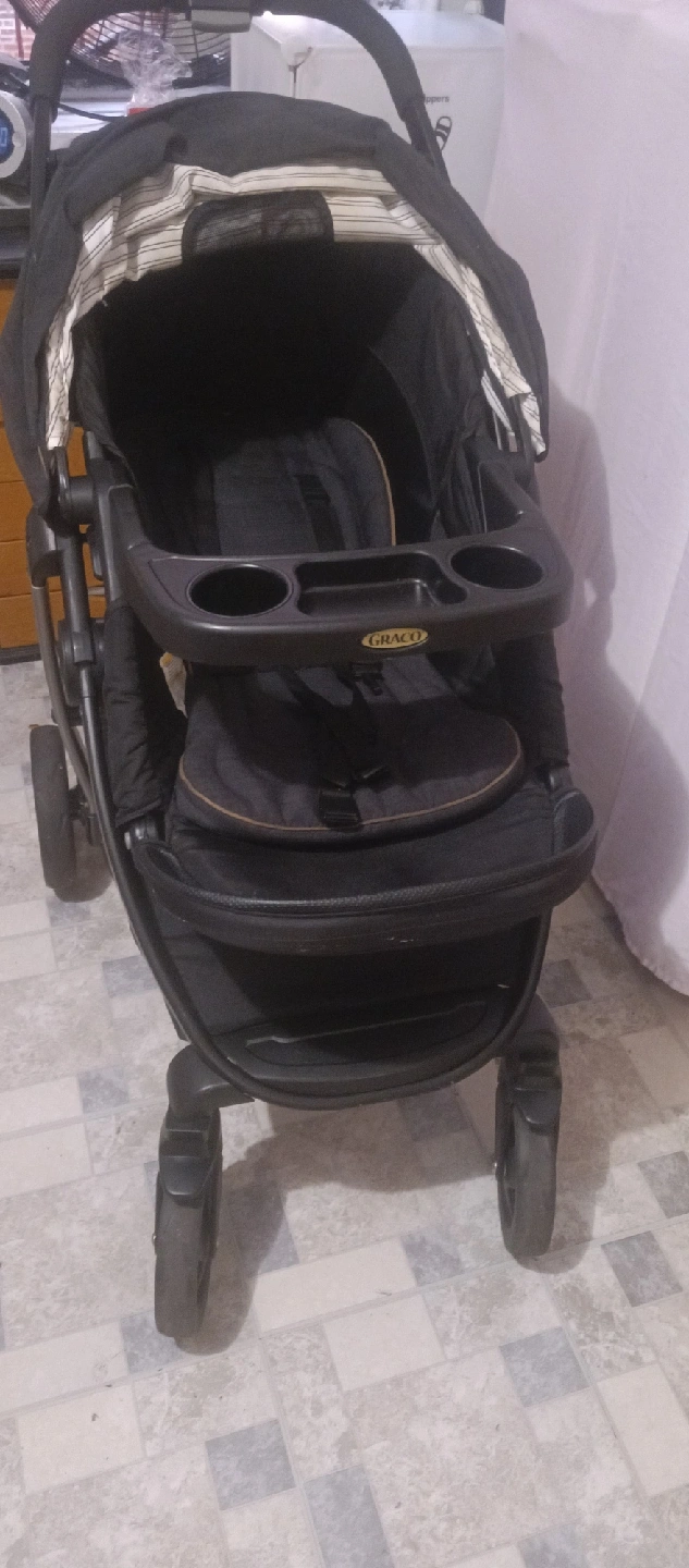 Selling a used Graco stroller in black. It has a tray with cup holders for the child and a large canopy to provide shade. It also has a storage basket underneath for carrying essentials. It's in good condition and ready for a new family! and car seat!