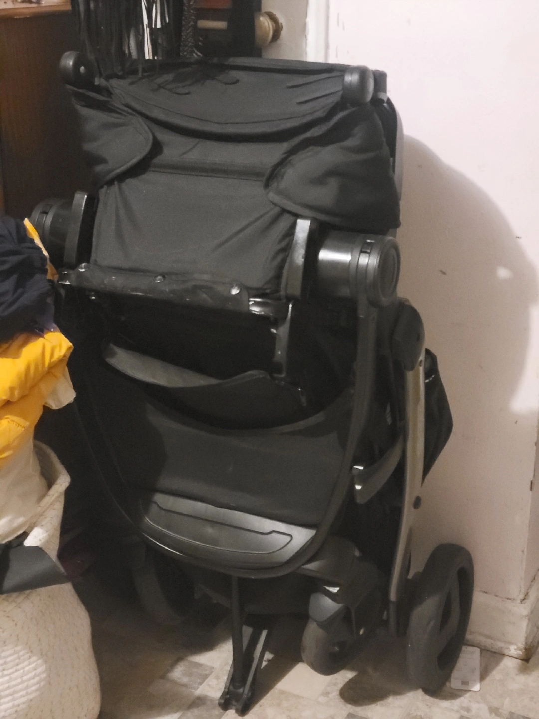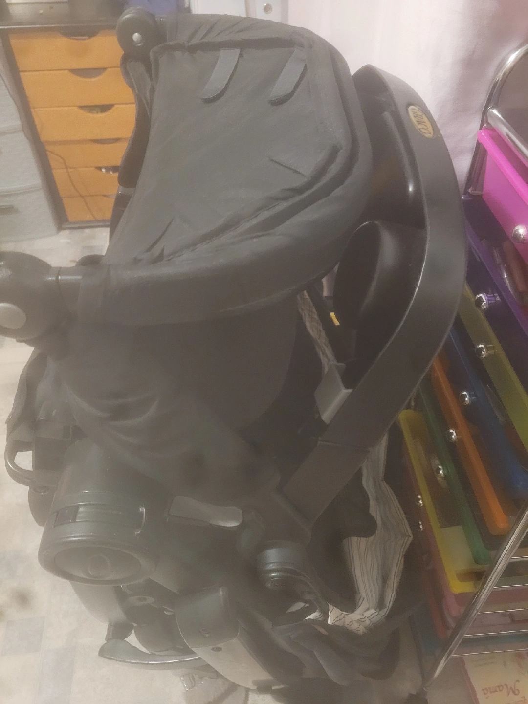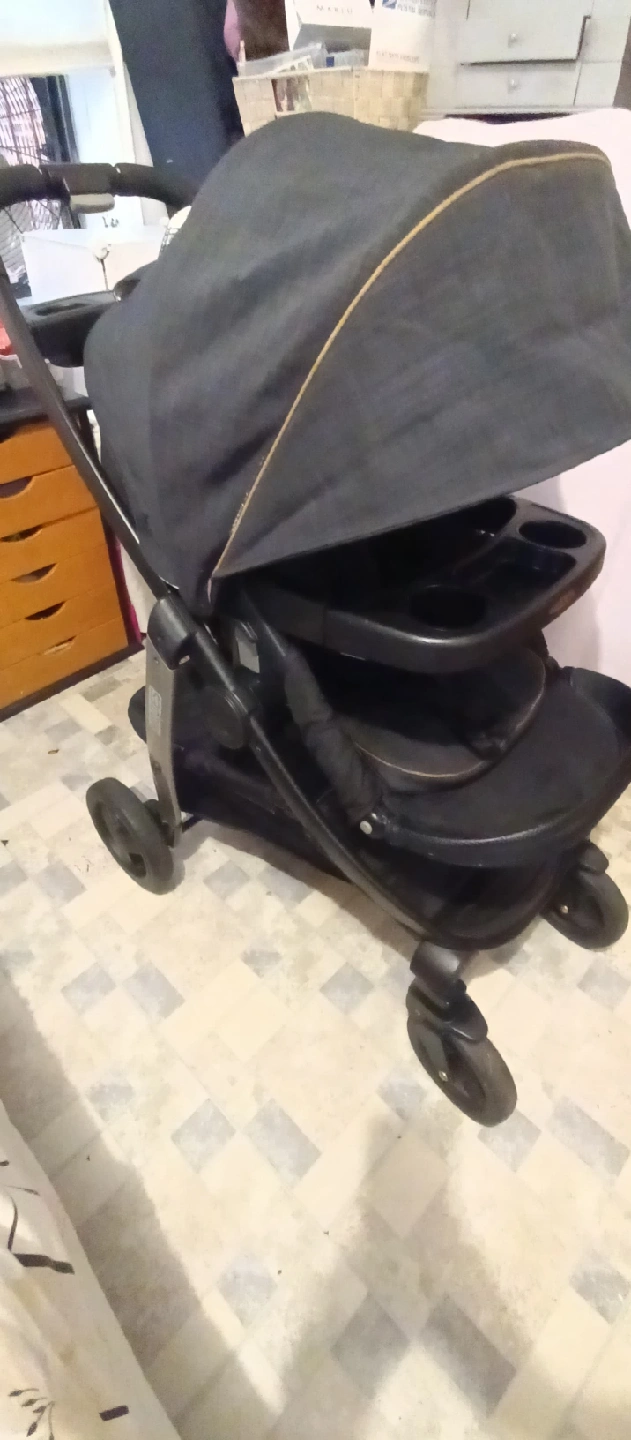 Selling a used Graco stroller in black. It has a tray with cup holders for the child and a large canopy to provide shade. It also has a storage basket underneath for carrying essentials. It's in good condition and ready for a new family! and car seat!