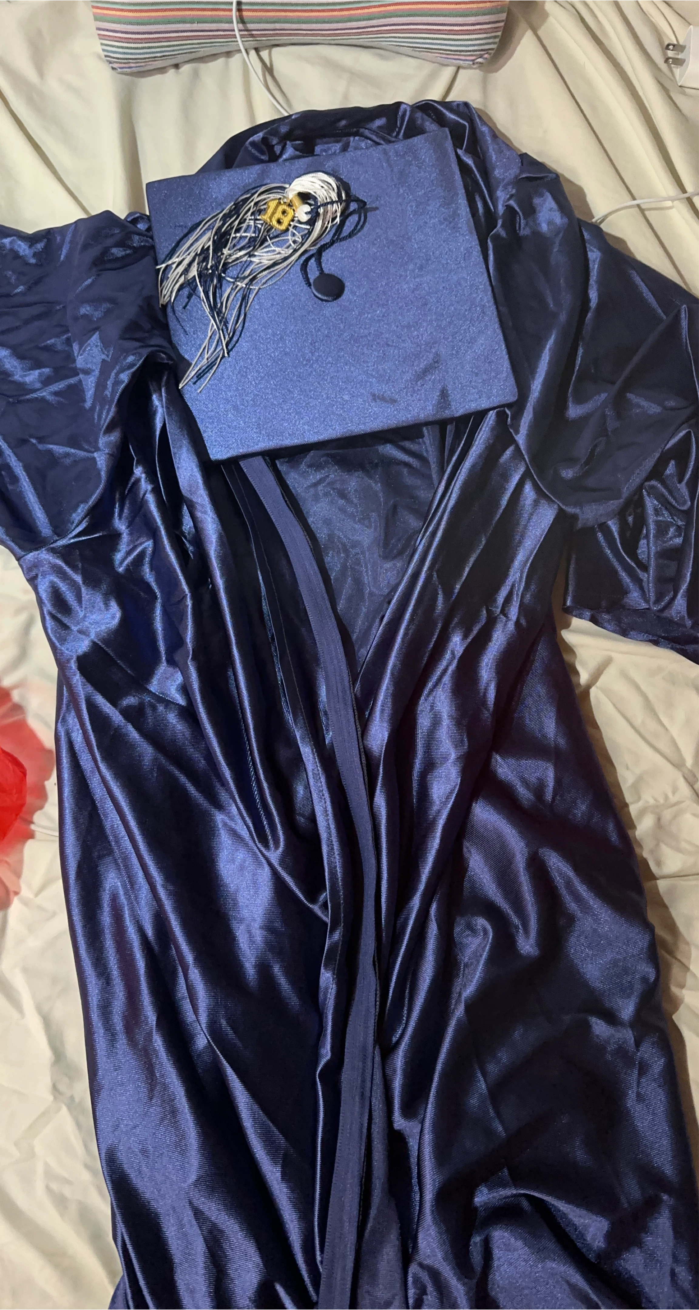 Selling a navy blue graduation gown and cap! It's in good condition and ready for your graduation day.