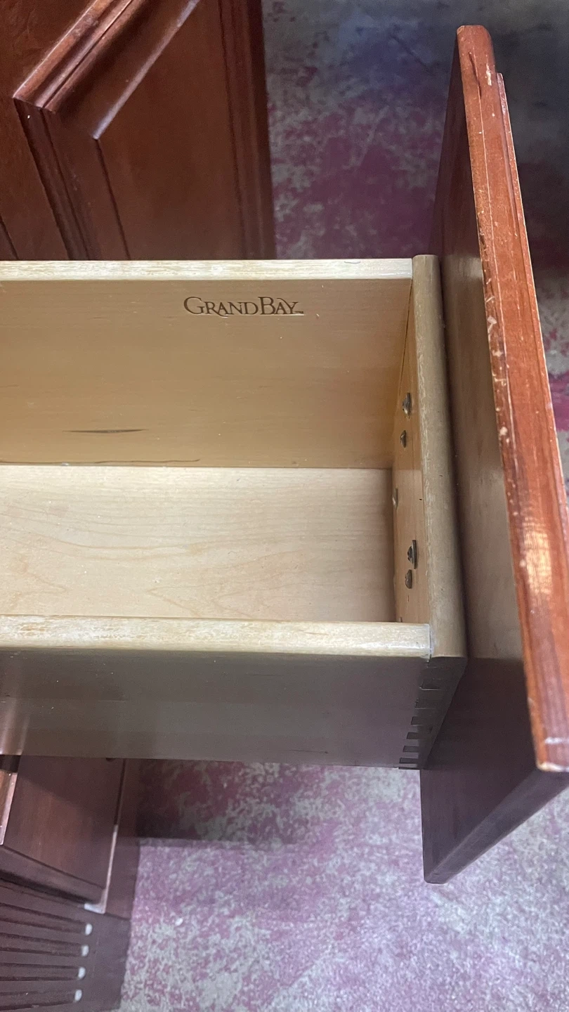 10Here's a Grand Bay bathroom vanity with a mirror. It features a dark granite countertop and a wooden cabinet with drawers and a door. The vanity has a classic design with decorative details