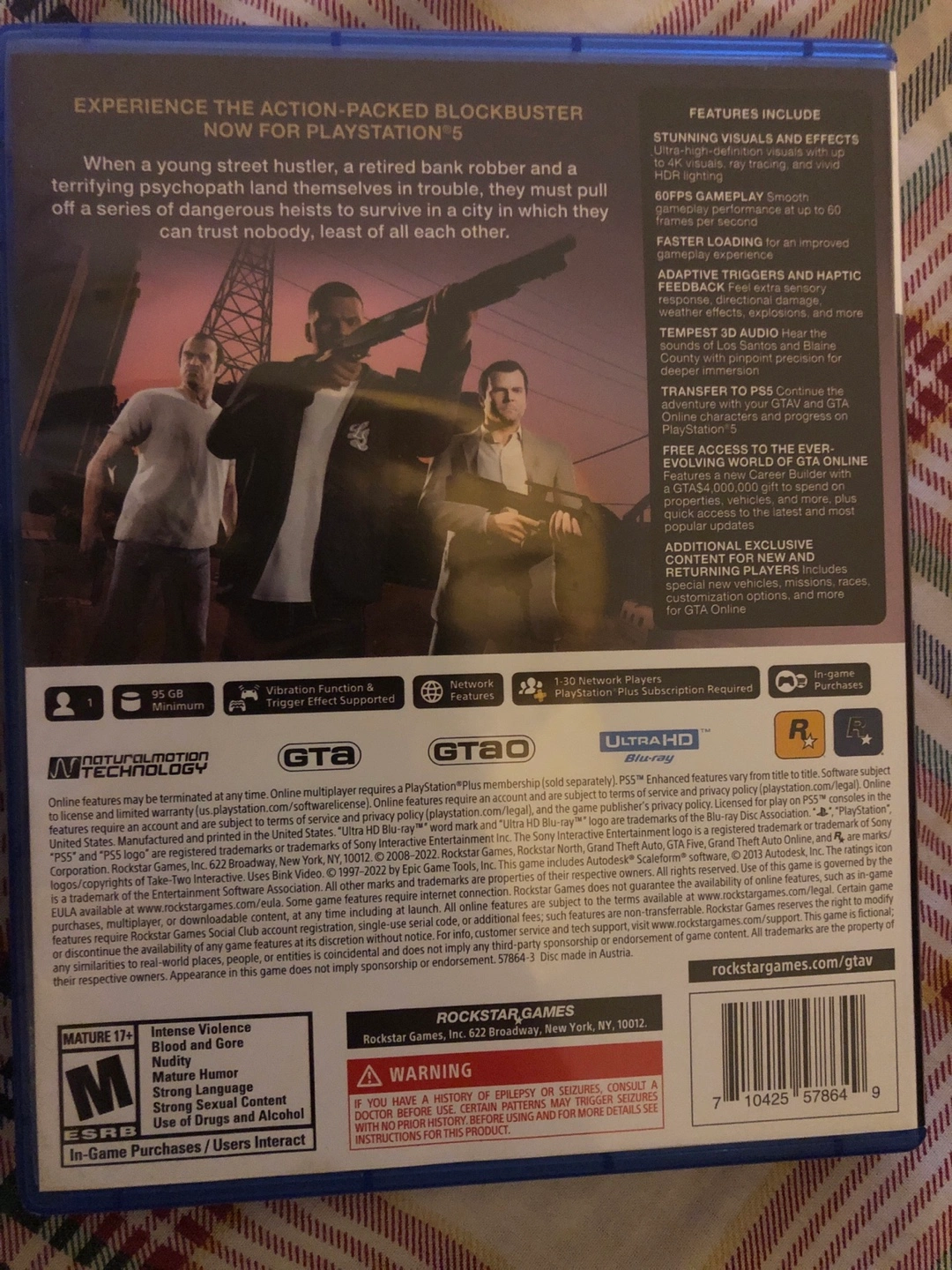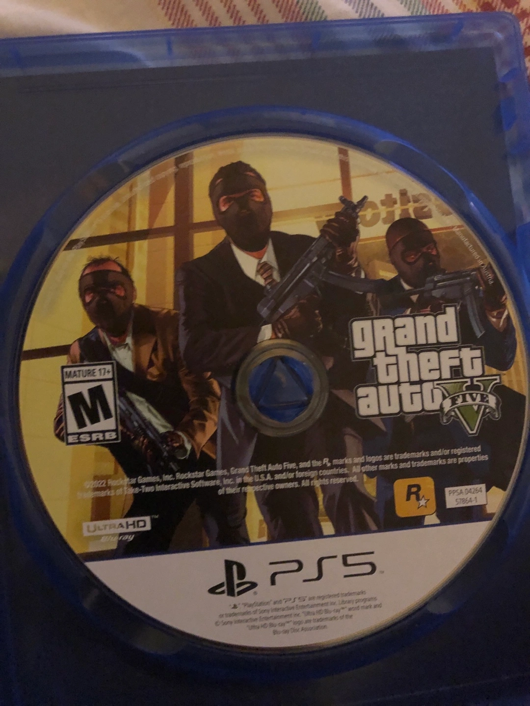 Selling Grand Theft Auto V (GTA 5) for the PlayStation 5! It's in great condition and ready for a new player to experience the action-packed story and stunning visuals. Enjoy the enhanced features and free access to the ever-evolving world of GTA Online