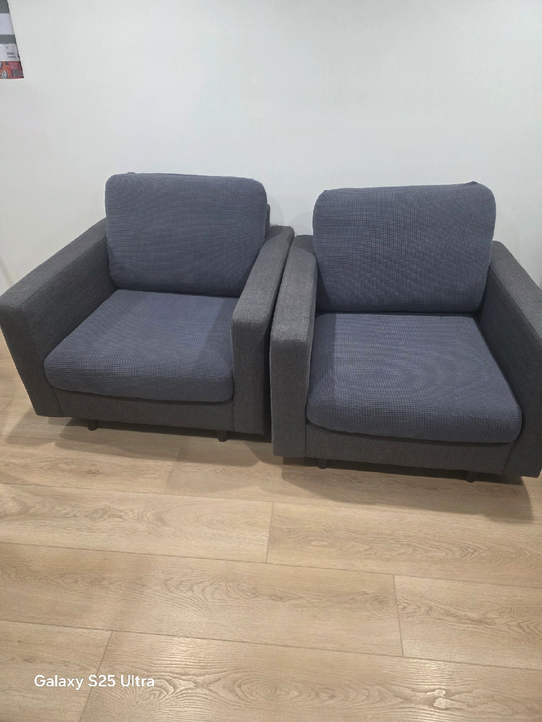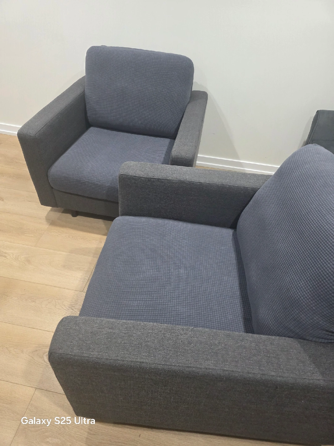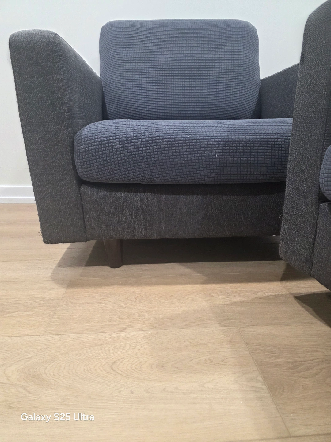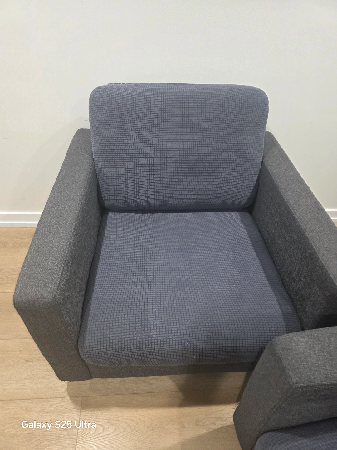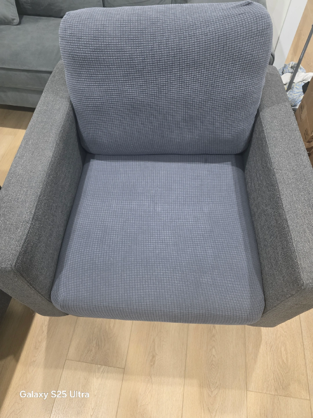 Selling a gray armchair that's in great condition! It has a comfortable seat and back, perfect for relaxing. The color is a neutral gray that would fit in most spaces. It's a great addition to any living room or bedroom