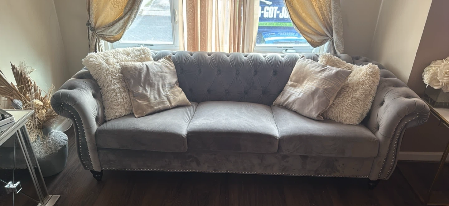 Selling a beautiful gray Chesterfield sofa! This stylish piece features a classic design with button-tufted detailing and comfortable cushions. It's perfect for adding a touch of elegance to any living room or seating area. It is in good condition and ready for a new home