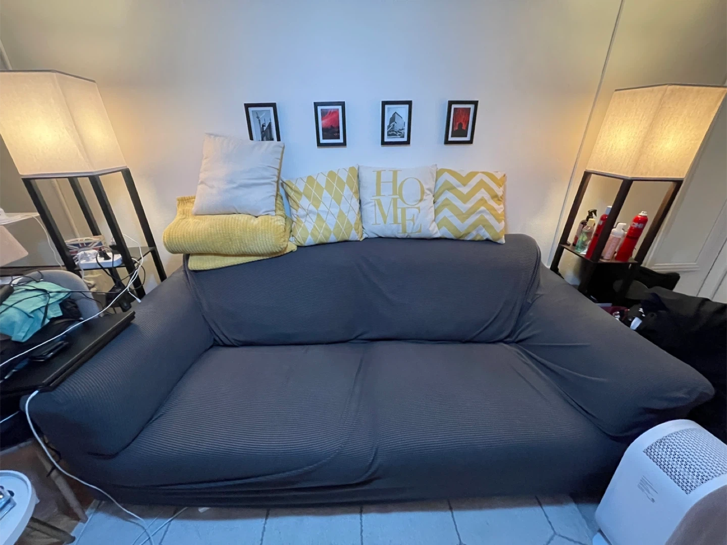 Selling a gray couch cover! It's in great condition and ready to give your couch a fresh, new look. The material is soft and comfortable, perfect for lounging. It's a simple and affordable way to update your living room decor. Must transport yourself and the couch can be taken apartment into 4 parts. Can sit up to 4-5 people