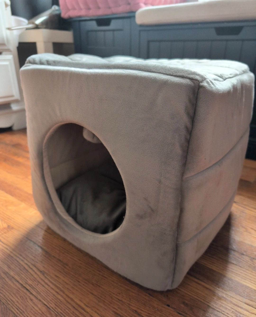I'm selling a cute and cozy cube-shaped cat house! It's in great condition and perfect for your furry friend to relax and play in. The soft material makes it a comfy spot for naps.
