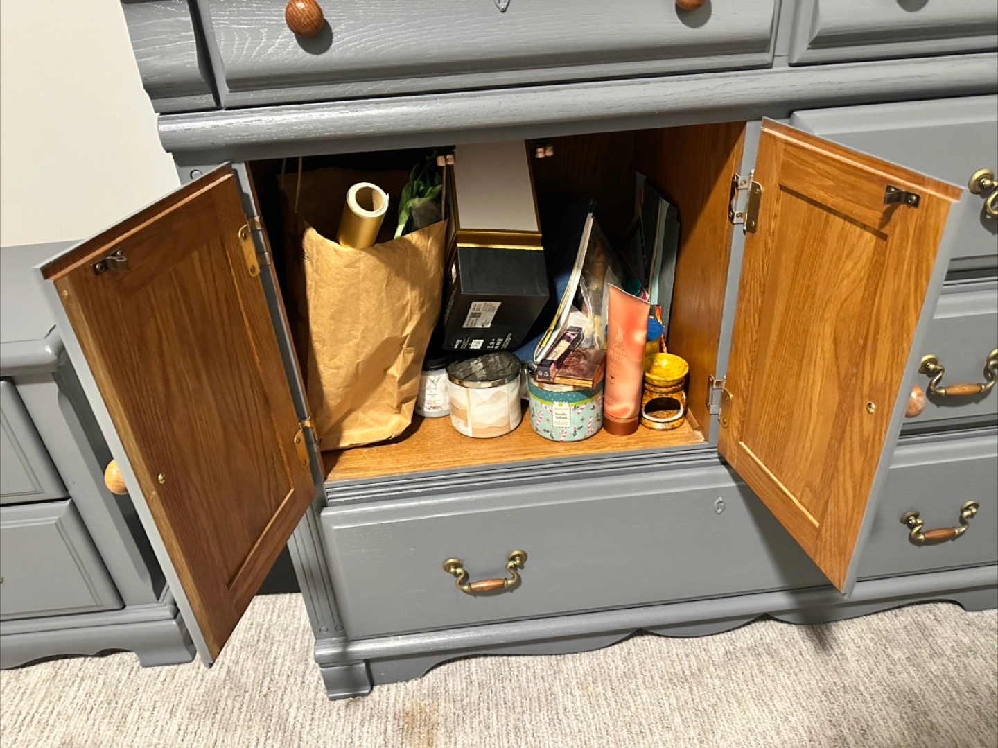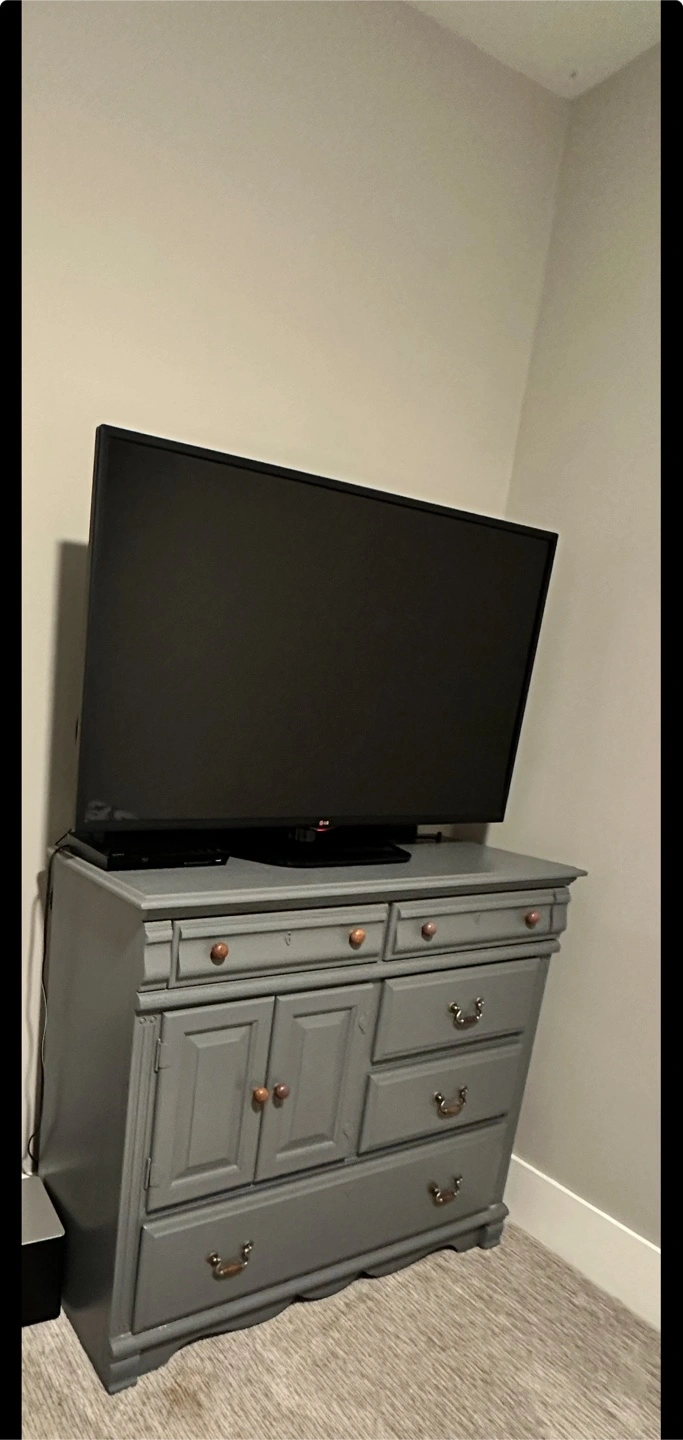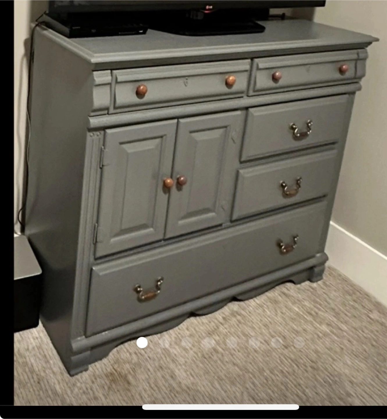 Selling a gray dresser with a cabinet! It features a cabinet with two doors and several drawers. The dresser measures approximately 48 inches in length, 17 inches wide and 48 inches long. Solid wood. Pick up only - Chicago-16th and Halsted SMOKE FREE HOME. Check out my other listings BELOW. I’m moving out of the country and need to sell 3000 SF of furniture out of a newer home. Check out this ‘Dyson V7 Animal Stick Vacuum’ on Karrot! The local community marketplace app: https://ca.karrotmarket.com/buy-sell/6126075 Check out this ‘28 Bottle Wine Refrigerator - 16.9" x 17.7" x 33.1"’ on Karrot! The local community marketplace app: https://ca.karrotmarket.com/buy-sell/6036860 Check out this ‘Sonos Arc, Sub G3 & (QTY 2) One SL US (Black)’ on Karrot! The local community marketplace app: https://ca.karrotmarket.com/buy-sell/5951236 Check out this ‘Thomasville Tisdale Modular Sectional Dark Gray’ on Karrot! The local community marketplace app: https://ca.karrotmarket.com/buy-sell/6035876 Check out this ‘3 Dressers plus + 4 matching End Tables - Glass Tops’ on Karrot! The local community marketplace app: https://ca.karrotmarket.com/buy-sell/6075188 Check out this ‘Tundra Hut Portable Sauna - XL Size’ on Karrot! The local community marketplace app: https://ca.karrotmarket.com/buy-sell/6092441 Check out this ‘Four (4) Ultra Comfort XL Folding Chairs’ on Karrot! The local community marketplace app: https://ca.karrotmarket.com/buy-sell/6091720 Check out this ‘8ft Fold-in-Half Black Banquet Table’ on Karrot! The local community marketplace app: https://ca.karrotmarket.com/buy-sell/6091688 Check out this ‘Wood and Metal Style Bed Frame + Metal Box Spring’ on Karrot! The local community marketplace app: https://ca.karrotmarket.com/buy-sell/6037014 Check out this ‘13 Pairs - OG AIR Jordan 1 Mid - Epic Bundle -Size 14’ on Karrot! The local community marketplace app: https://ca.karrotmarket.com/buy-sell/5950966 Check out this ‘Christian Louboutin Slingback Heels Black Suede Python Size 6.5’ on Karrot! The local community marketplace app: https://ca.karrotmarket.com/buy-sell/6036471 Check out this ‘Gray Leather Sectional Left & Right Facing Chaise Sofa + Ottoman’ on Karrot! The local community marketplace app: https://ca.karrotmarket.com/buy-sell/6036382