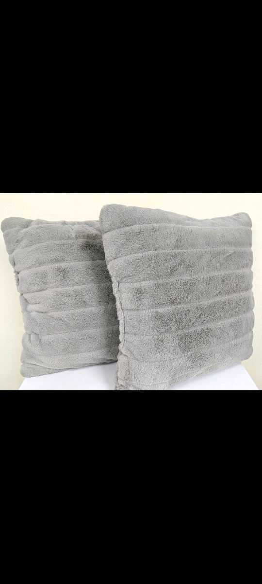 95Two faux fur pillows in a gray color. They have a plush texture, making them very comfy. They are perfect for those cozy nights spent on the couch, reading a book or watching your favorite movie.