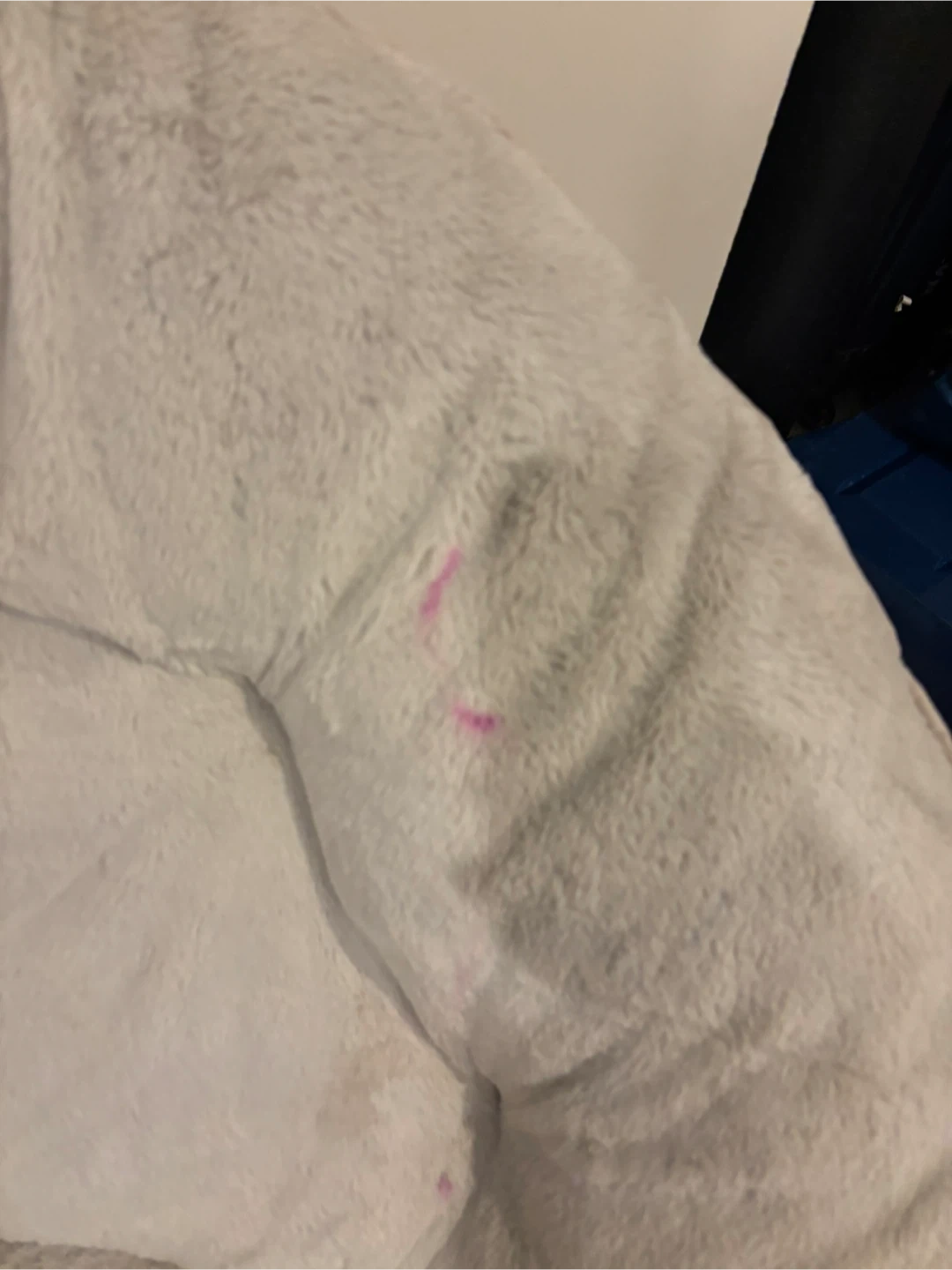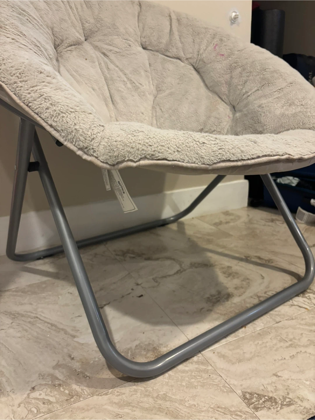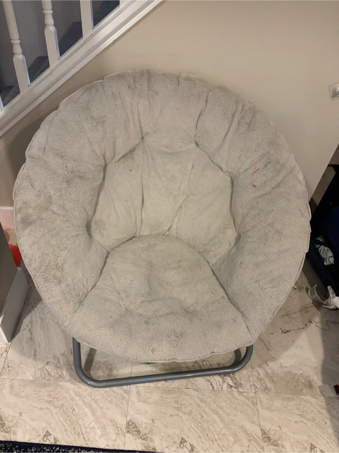 110Selling a gray faux fur saucer chair. It has a metal frame and a soft, comfortable seat. There are some signs of use, including some stains on the seat. It's still a great chair for relaxing or reading a book!