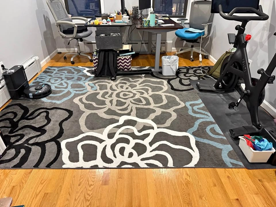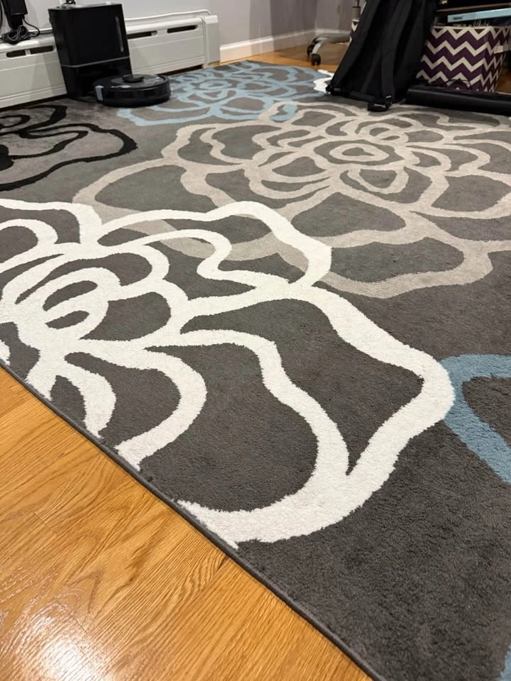 Gray rug with flowers in white, black, light blue, and light gray. 8 feet by 10 feet.