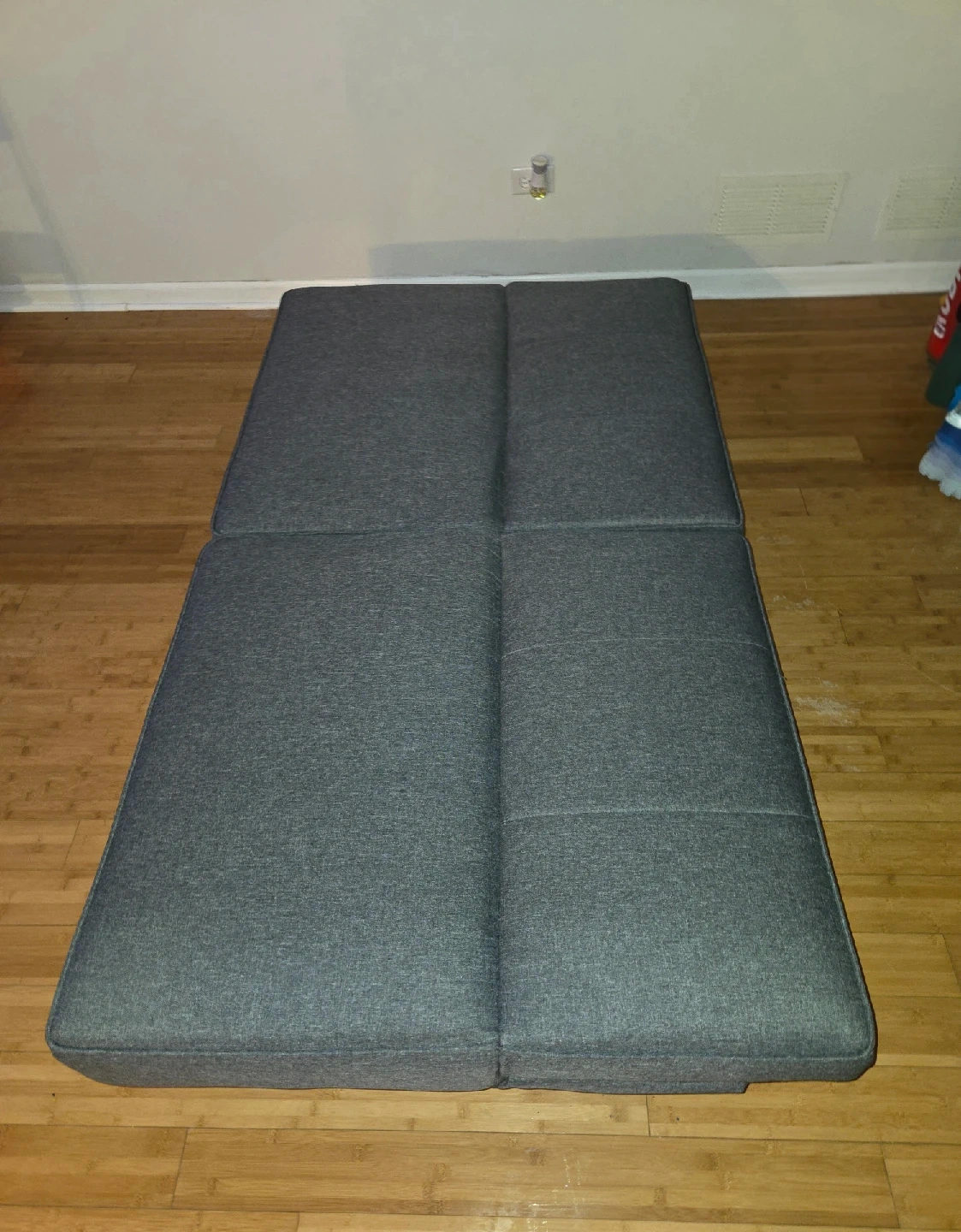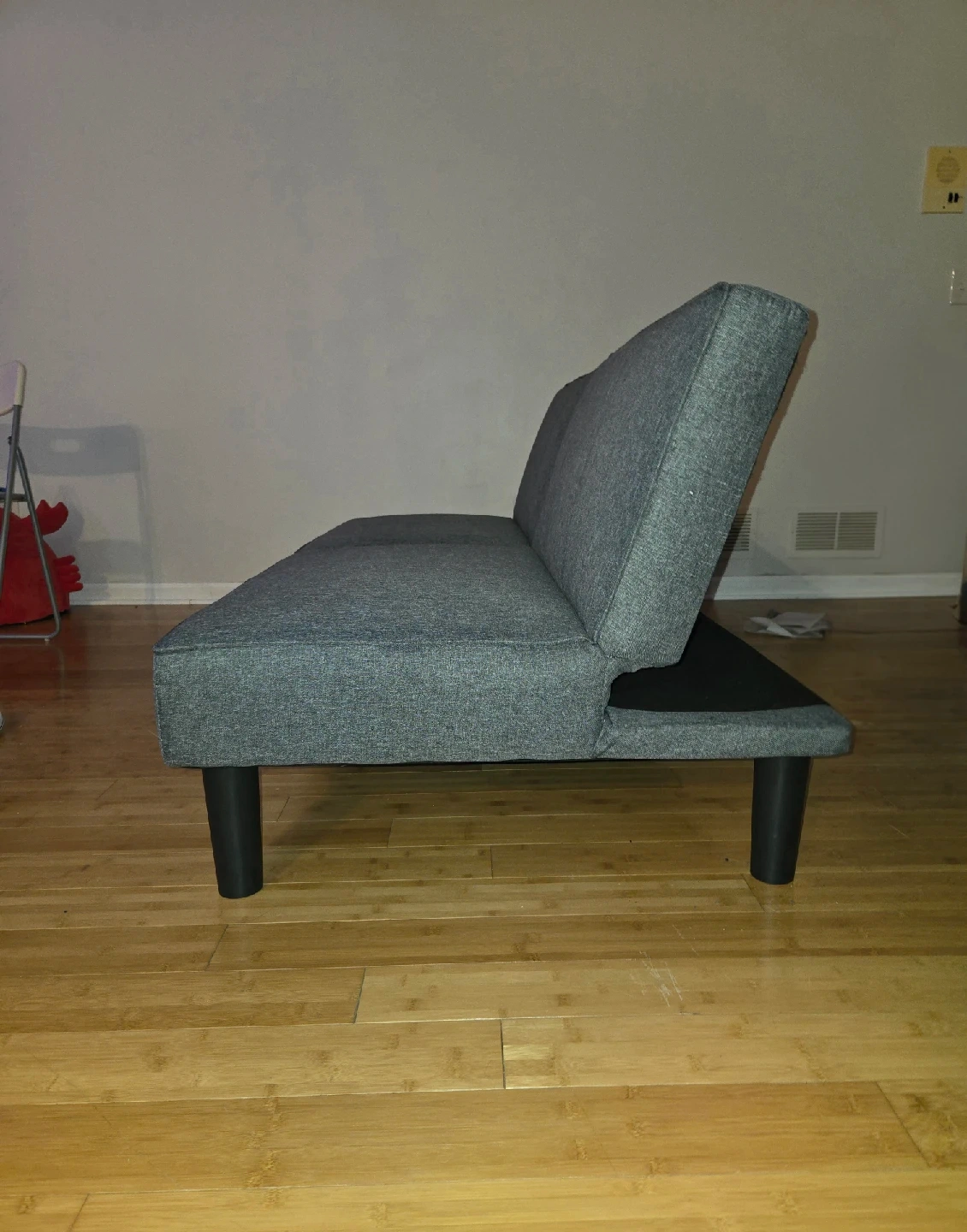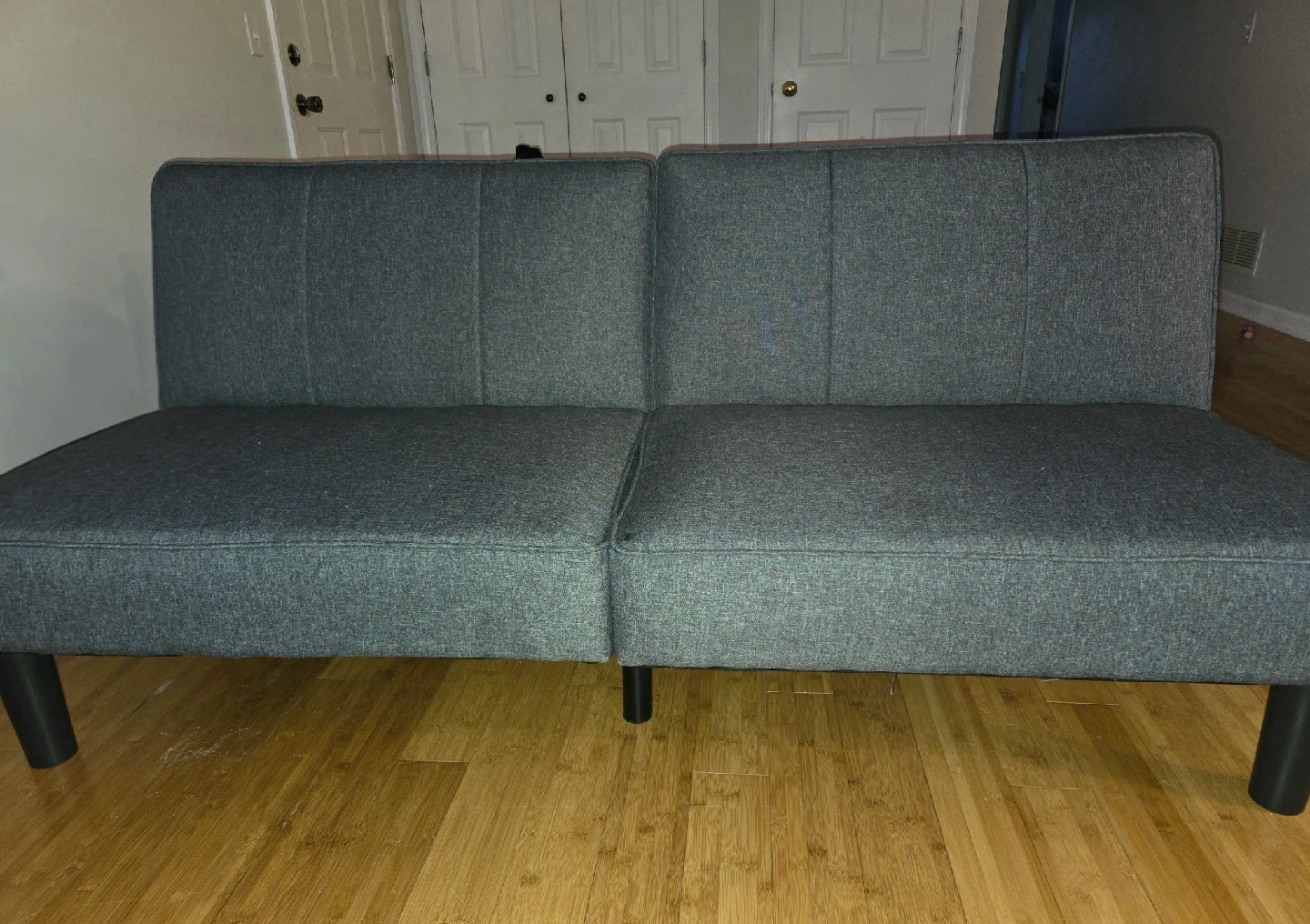 71Selling a gray futon sofa bed! It's in great condition and perfect for a living room or guest room. It can be used as a sofa or folded down into a bed. The material is a durable fabric, and it has black legs. Coming from a smoke free home.
