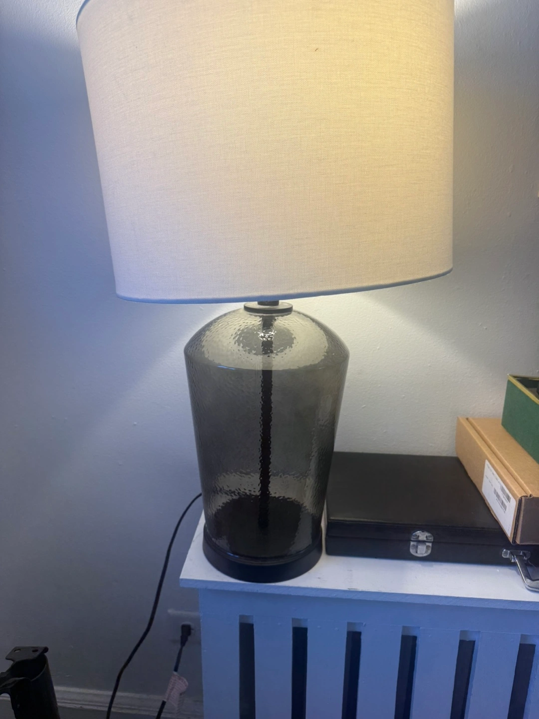 89Stylish table lamp. Features a dark gray glass base and an off-white fabric shade. Simple and elegant design. Perfect for a bedside table or end table.