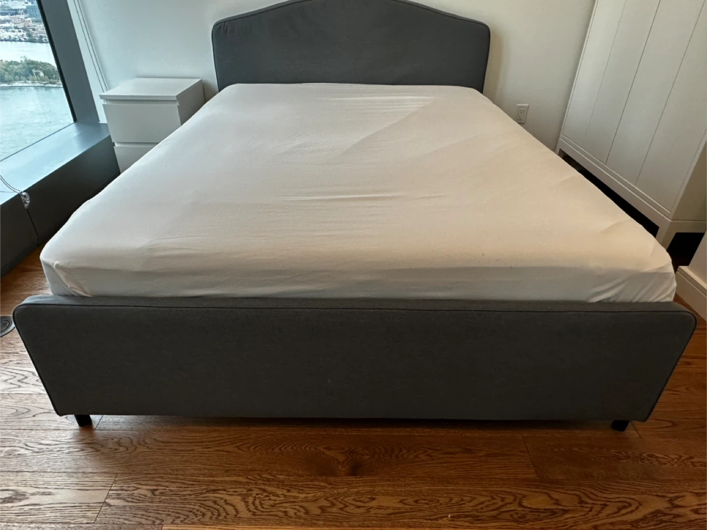 10Selling IKEA queen size gray upholstered bed frame! It's in good condition and the mattress will be free. Smoke and pet free home. Pick up only. Elevator is available.