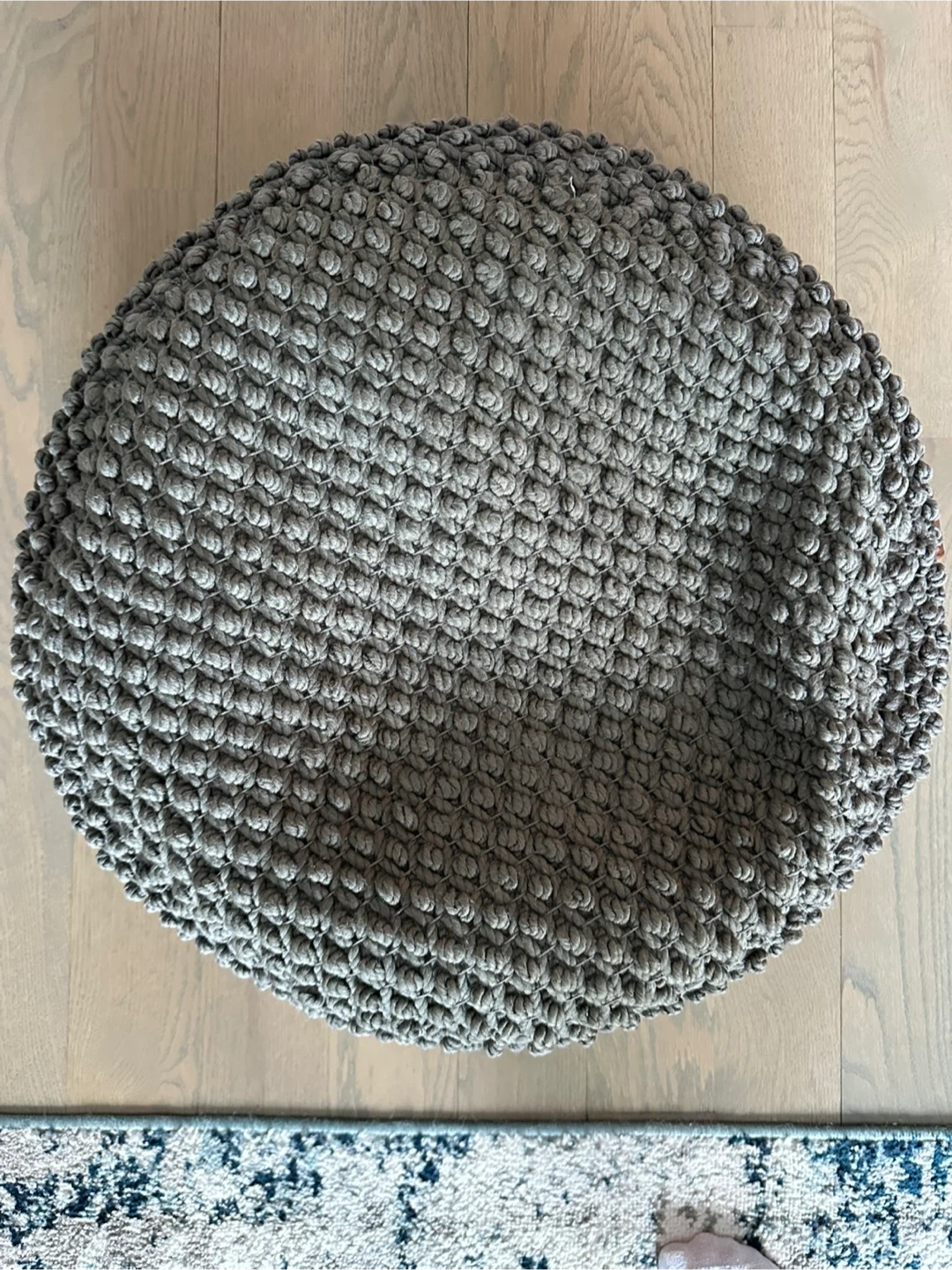 105Selling a comfy gray knitted pouf ottoman! It's in great condition and perfect for adding extra seating or a cozy footrest to your living space. The knitted texture adds a nice touch to any room
