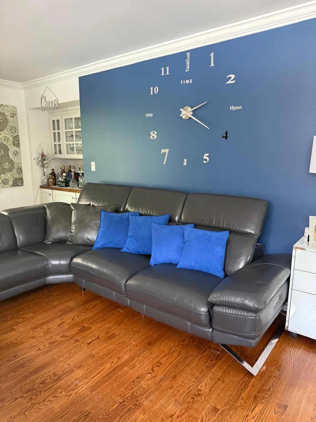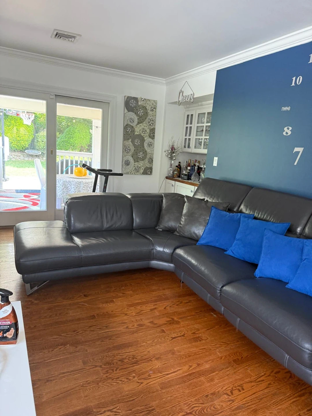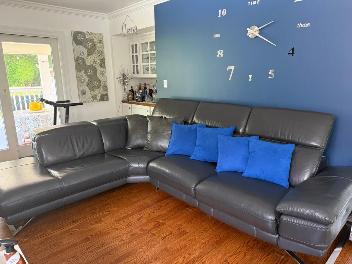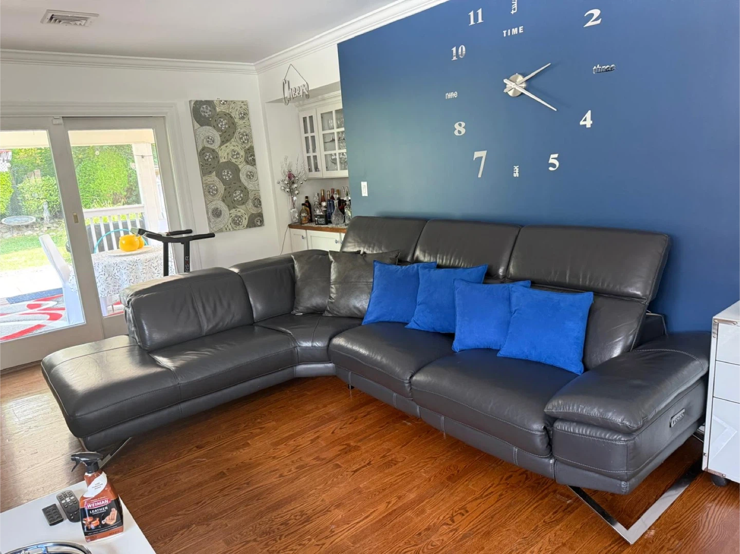 15Selling a comfortable gray leather sectional sofa. It's in good condition and would be a great addition to any living room! The sectional is perfect for lounging and relaxing after a long day. It features a modern design with chrome legs and comes with several throw pillows. Feel free to reach out if you're interested!
