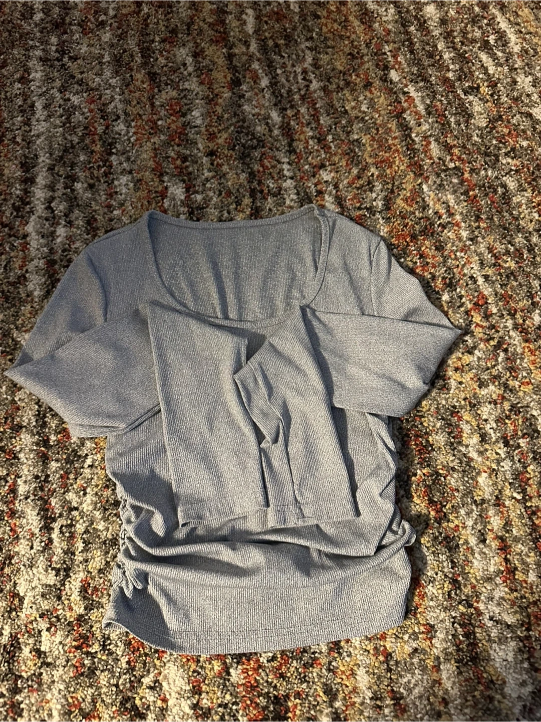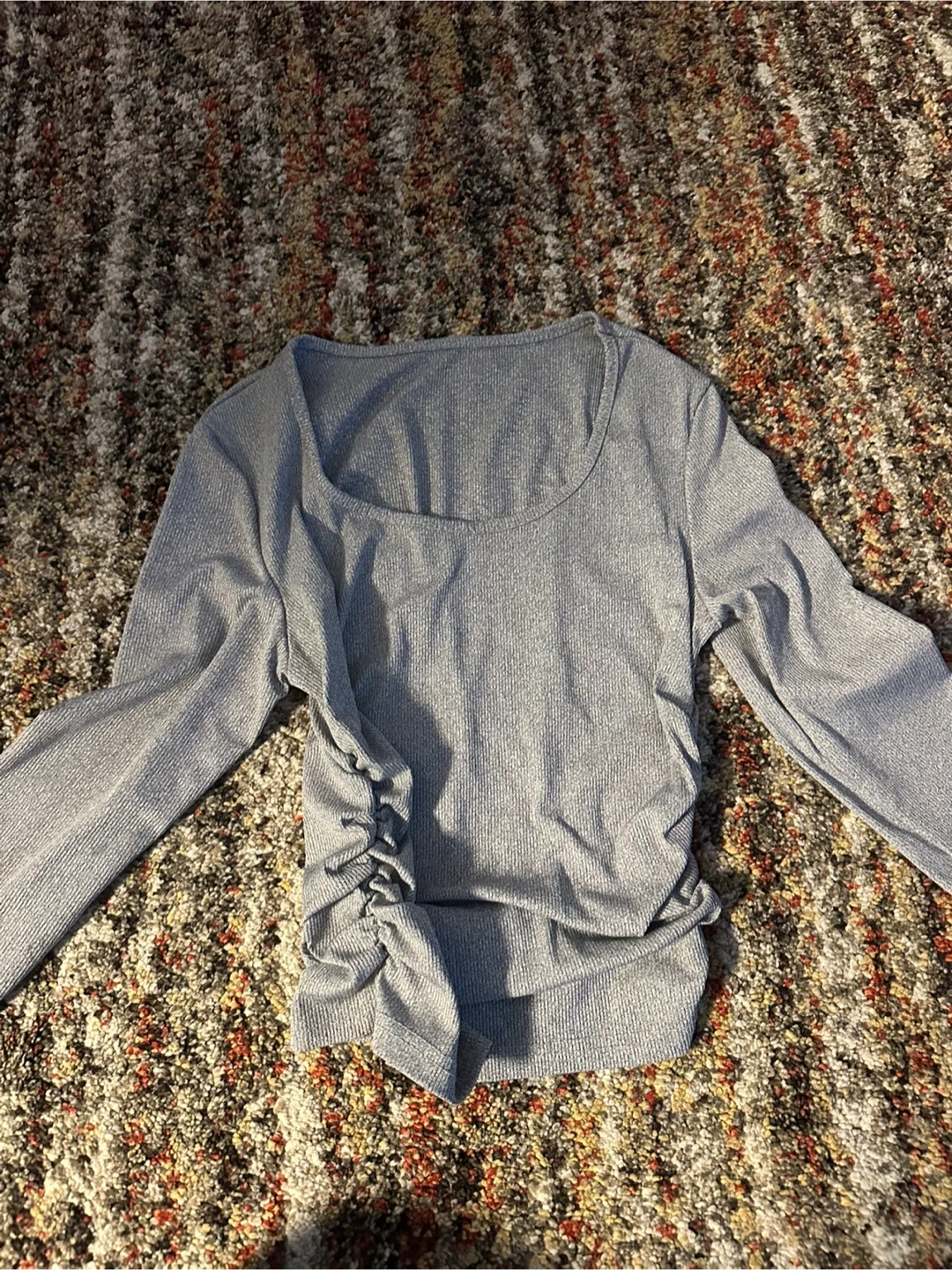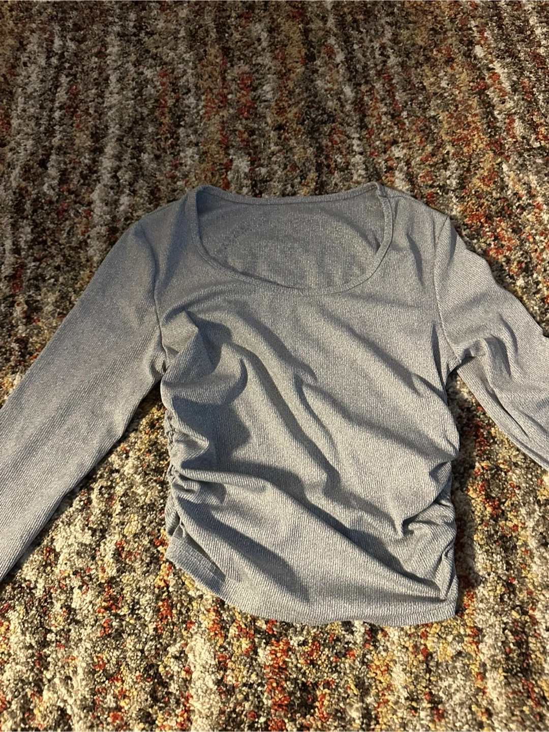 Selling a gray long sleeve top! It's in great condition and has a ribbed texture. The sides have a cute cinched detail that adds a little flair to the simple design