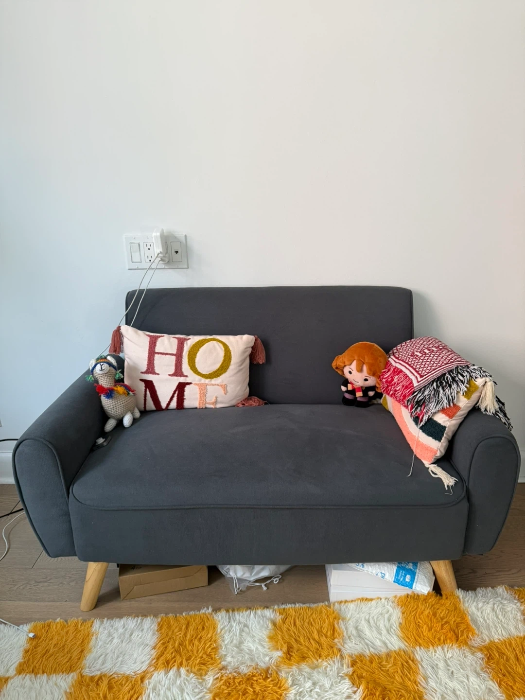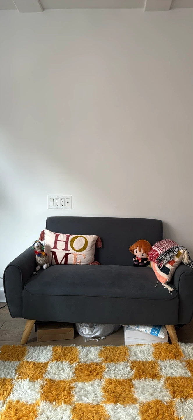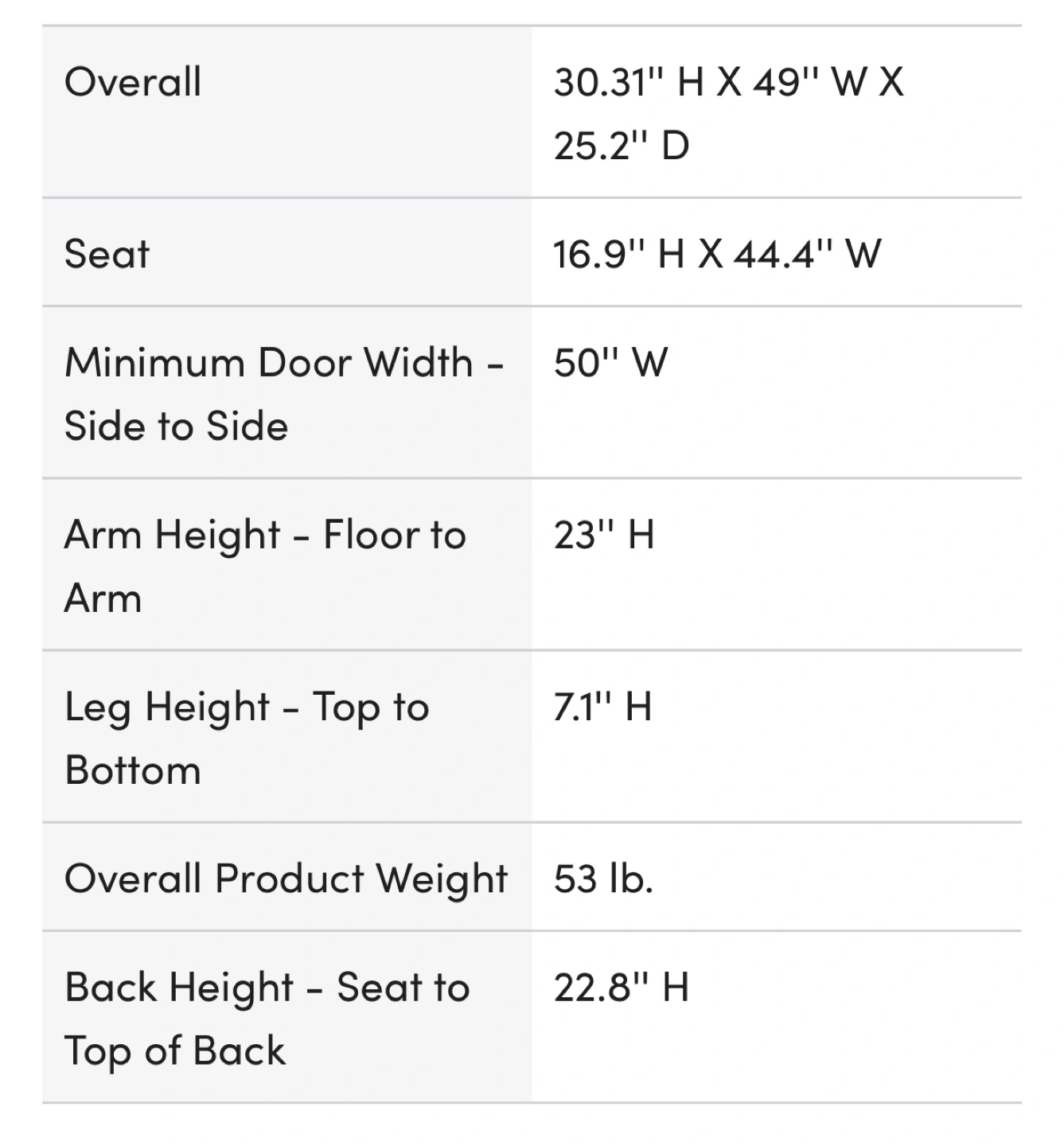 10Selling a comfortable gray loveseat sofa. It's in great condition and ready for a new home! The dimensions are 30.31" H x 49" W x 25.2" D. The seat is 16.9" H x 44.4" W, and the arm height is 23" H. The legs are 7.1" H, and the sofa weighs 53 lb