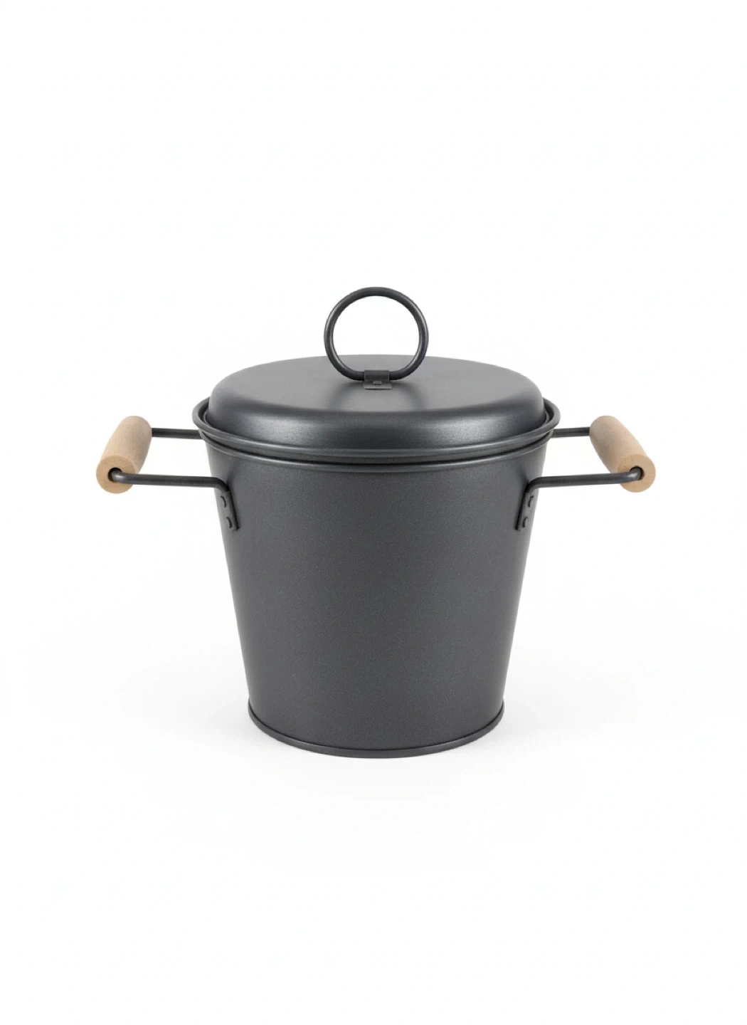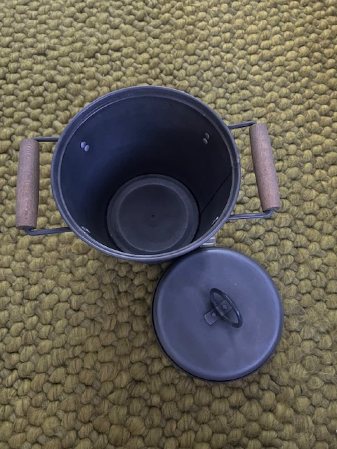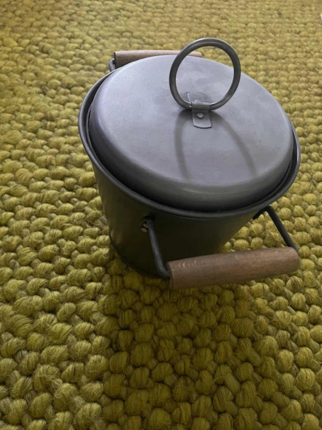 Selling a gray metal bucket with a lid and wooden handles! It's in great condition and ready for a new home. Perfect for storage or decor!
