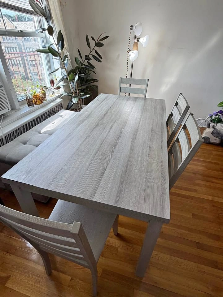 Full dining set from Macys. Dining Table: 72” x 38” x 30”. 4 Chairs included. Move Out Sale