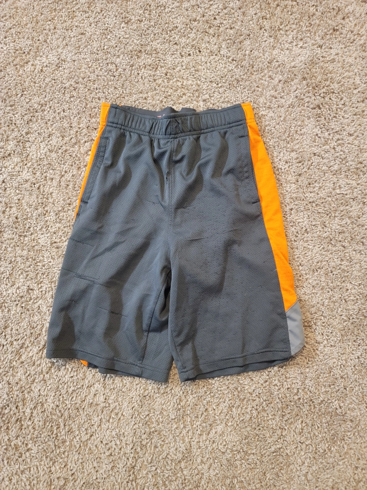Selling a pair of gray athletic shorts with orange accents. Some pilling from active boy wear