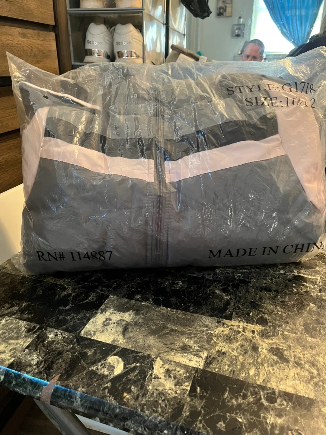 10Here's a jacket in a plastic bag. It's gray and pink and the size is 10/12. It's style G17/8.