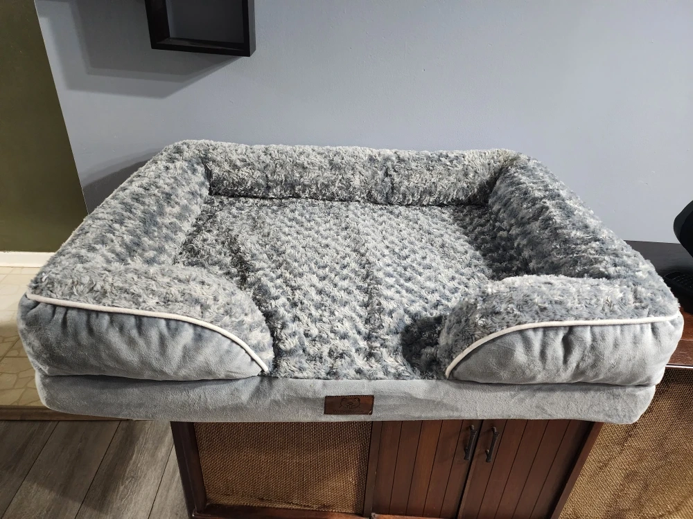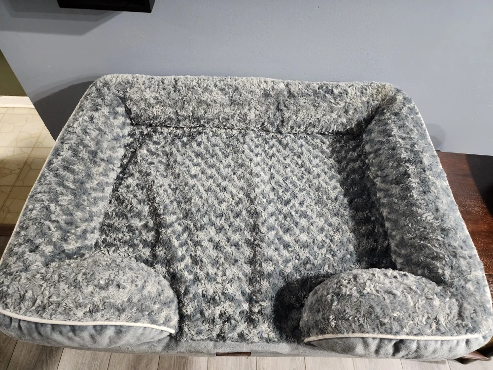 60Selling a cozy gray plush dog bed! It's in great condition and ready for a new furry friend to enjoy. The bed features a soft, textured surface and supportive sides, perfect for your dog to curl up and relax. It's a great addition to any home!