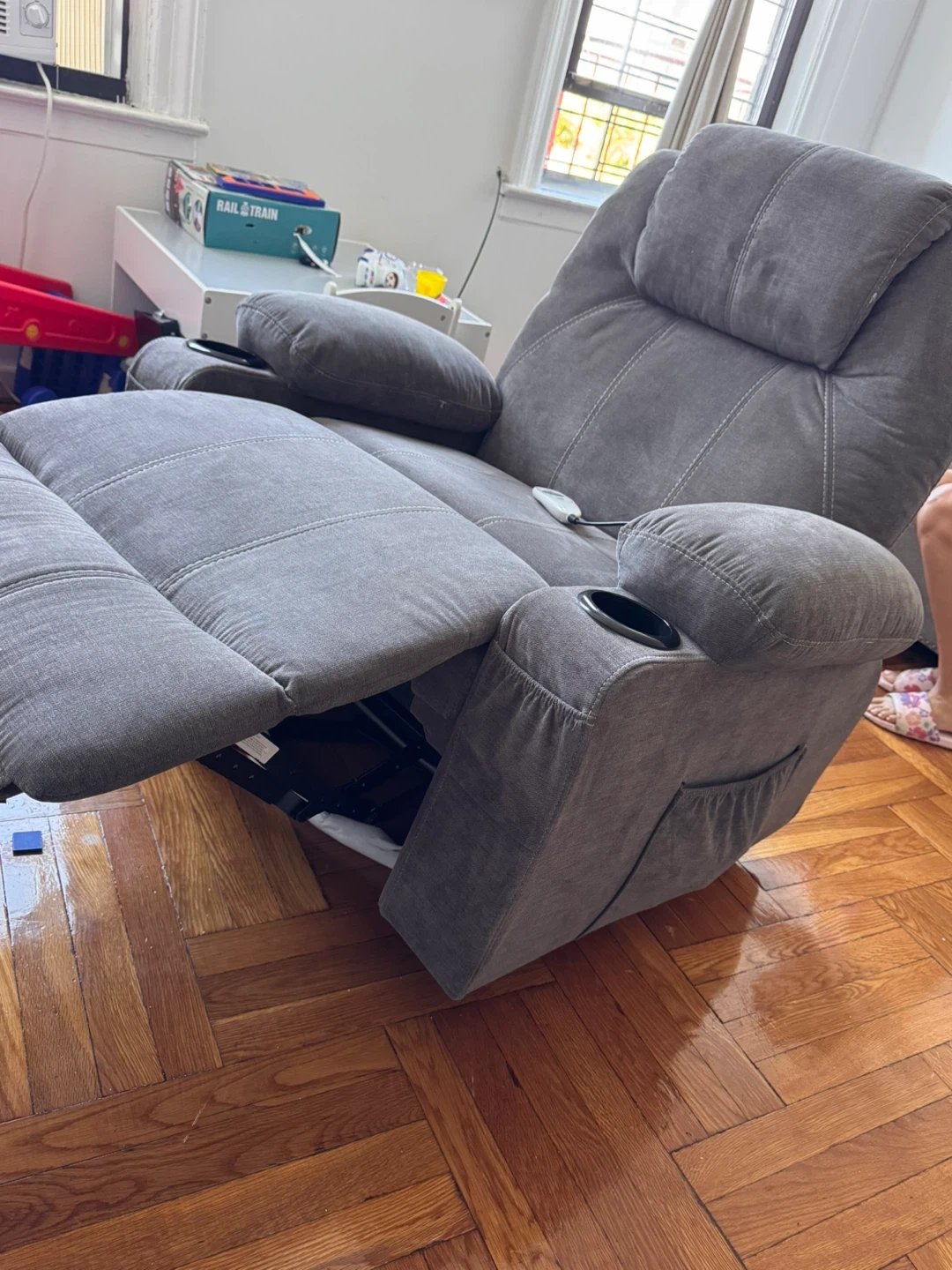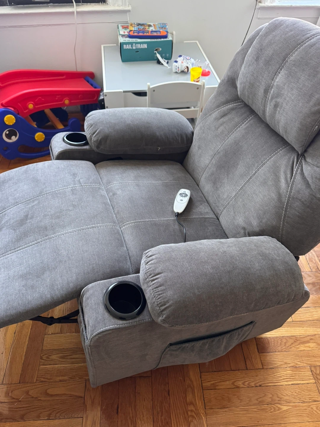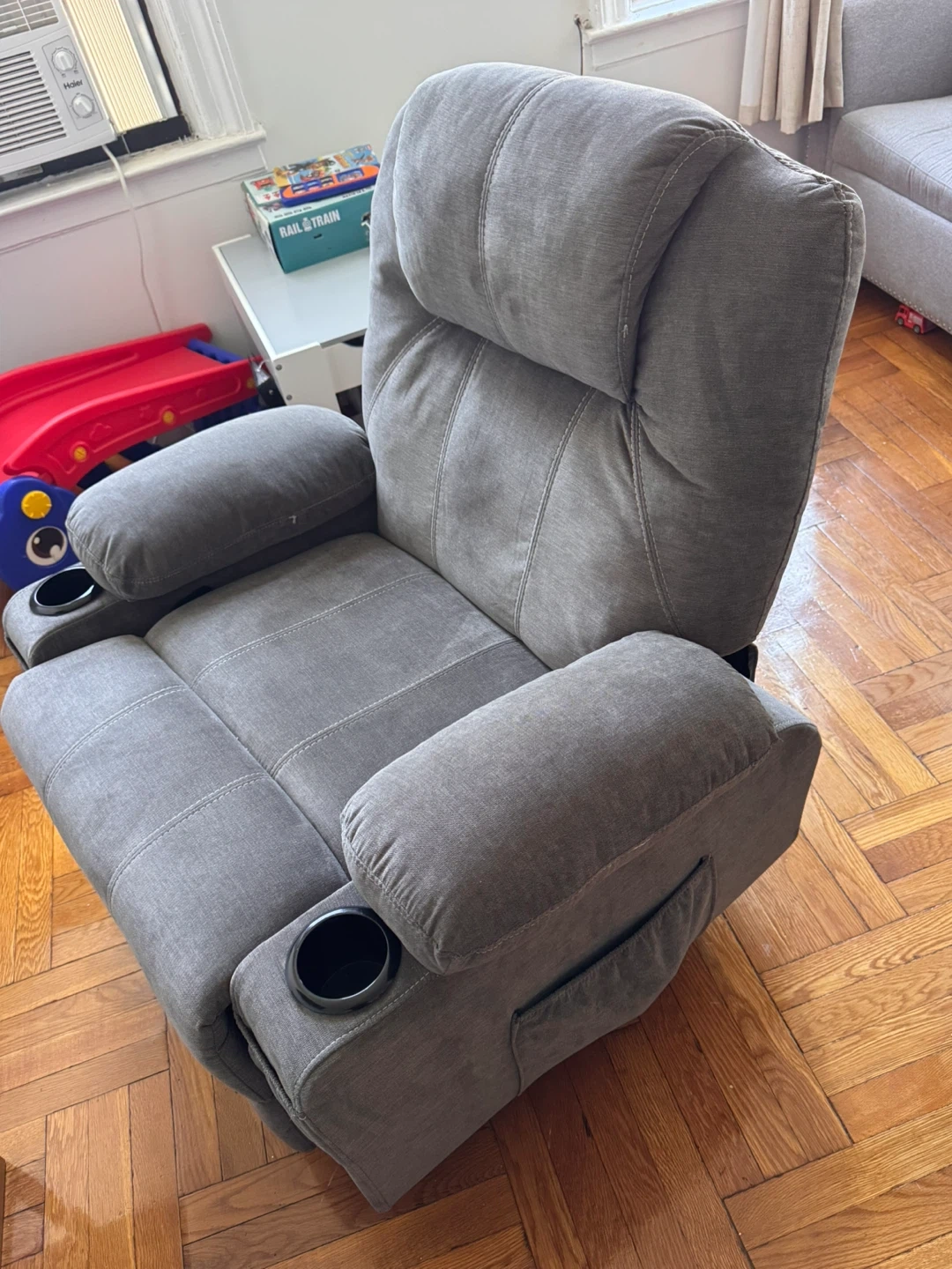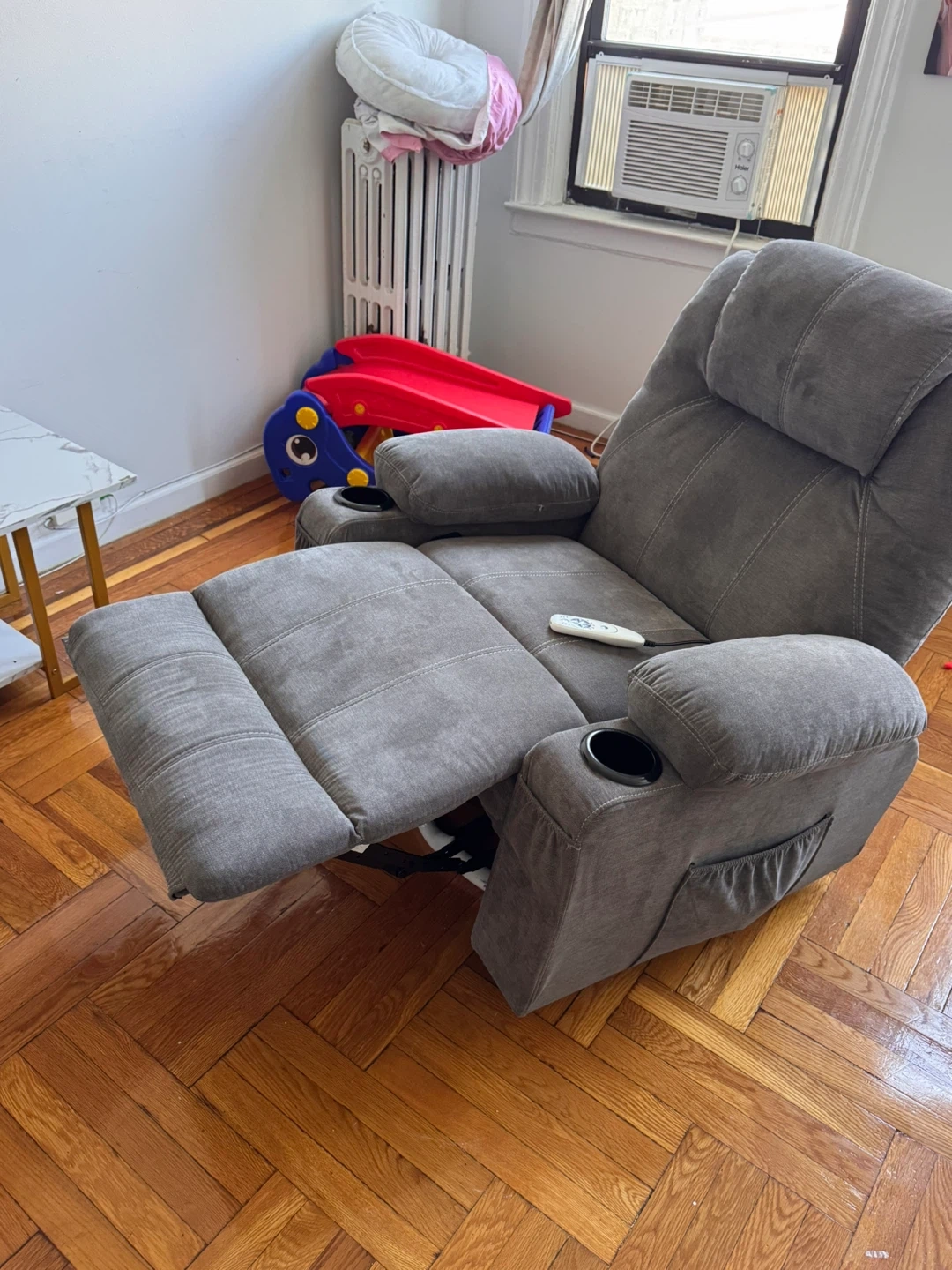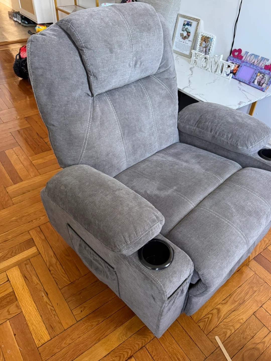 Selling a comfortable gray recliner chair. It features built-in cup holders for your convenience. Great for relaxing and watching movies!, It's like new, it was just removed from the packaging, I'm selling it because I don't have much space in my apartment.