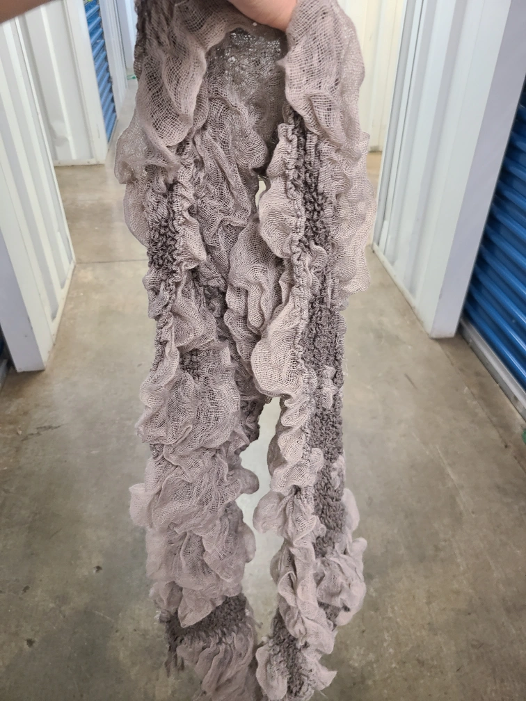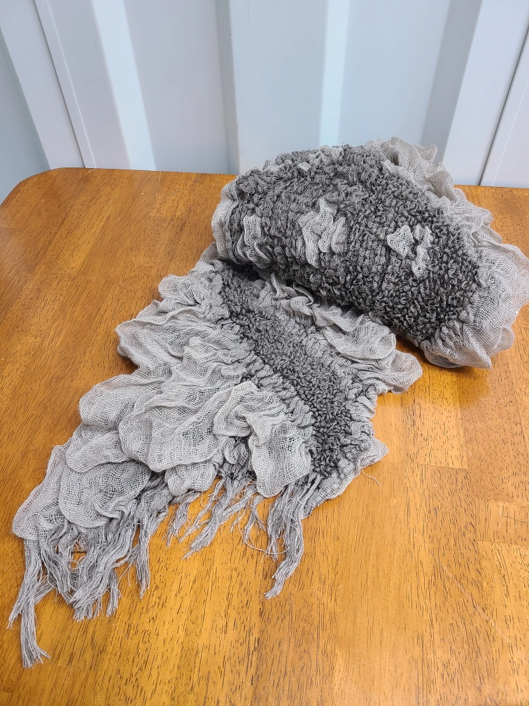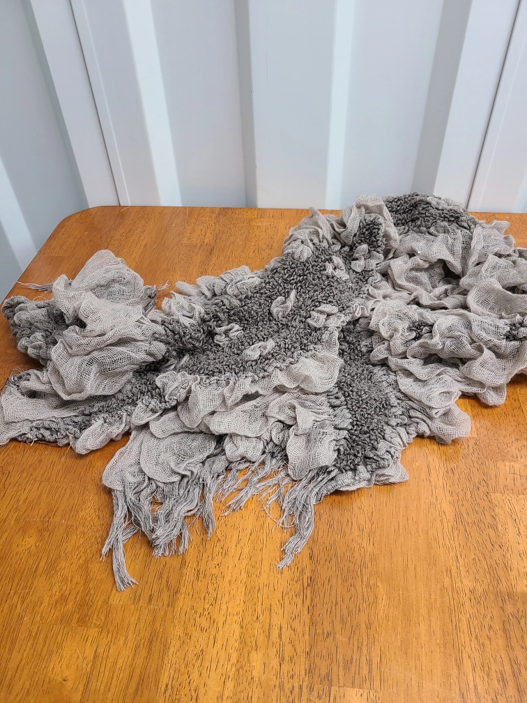 18This is a gray scarf with a ruffle design. It's in great condition and ready to add a unique touch to your wardrobe! The scarf features a textured, layered look with fringed edges.
