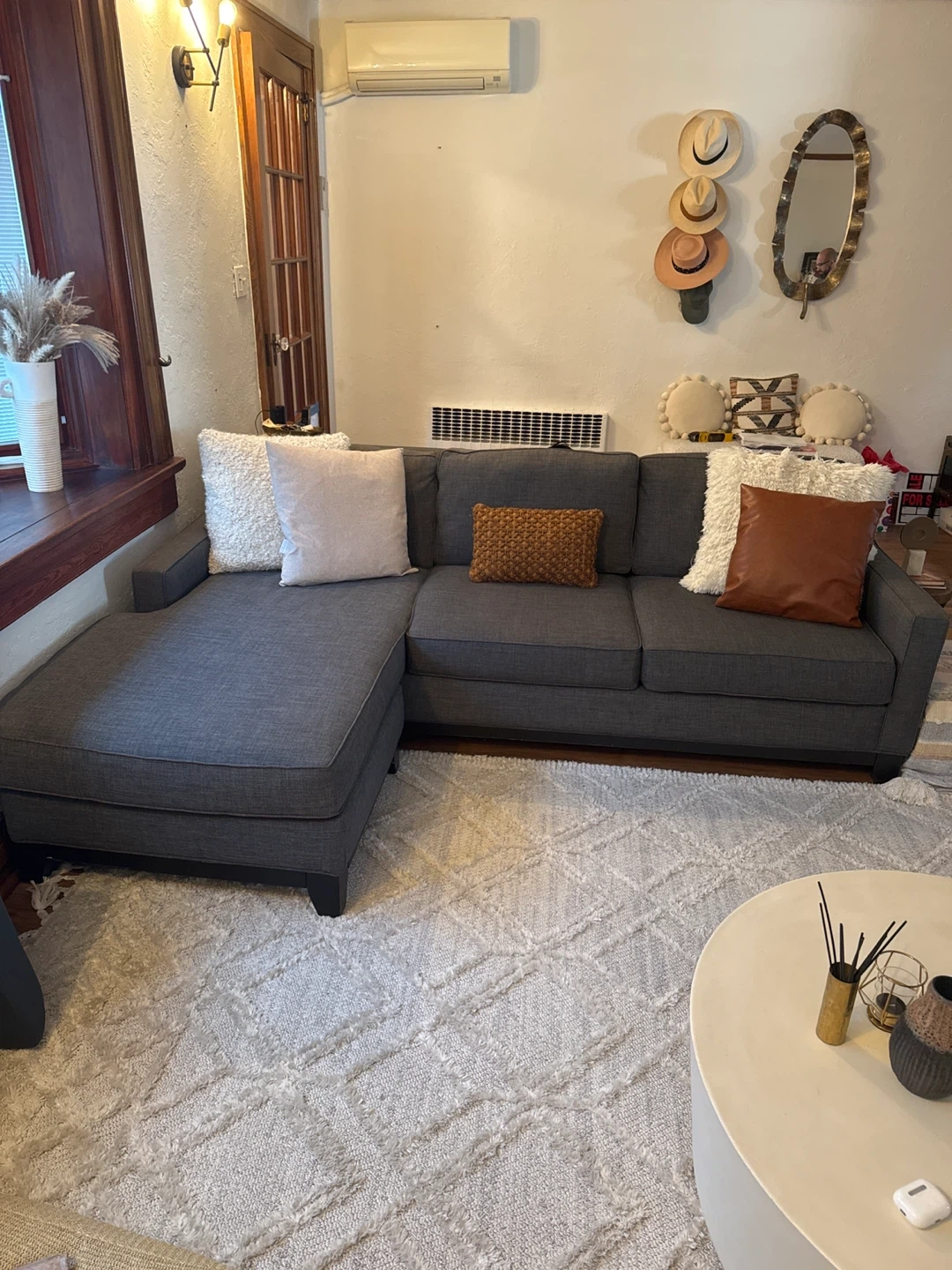 65Selling a comfy gray sectional sofa. It's in great condition. The sectional design is perfect for lounging and adds a modern touch to any living space. It features a chaise lounge on one side for extra relaxation. Perfect for movie nights or having friends over