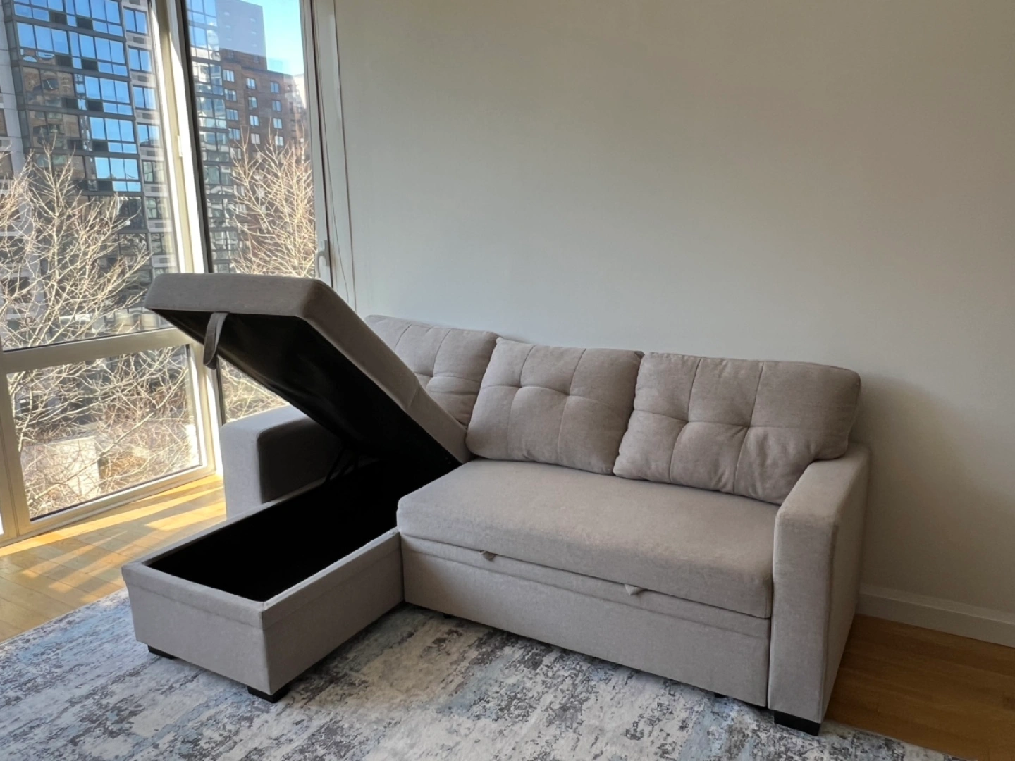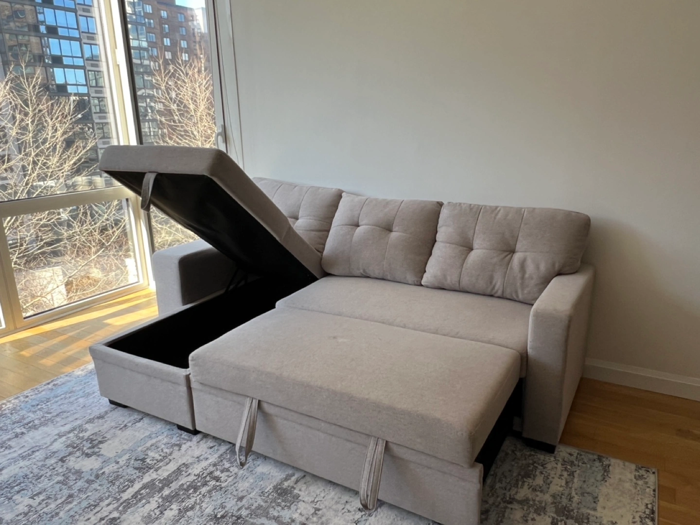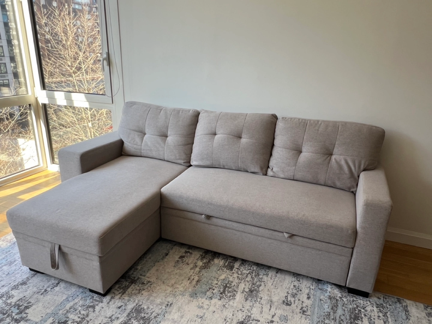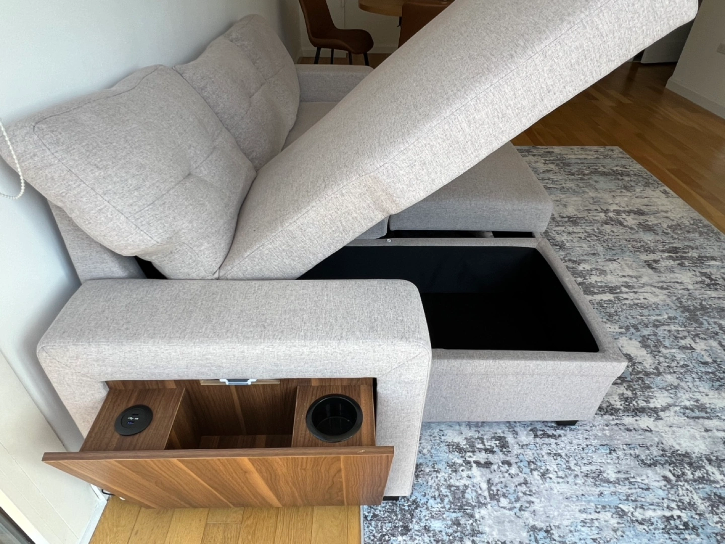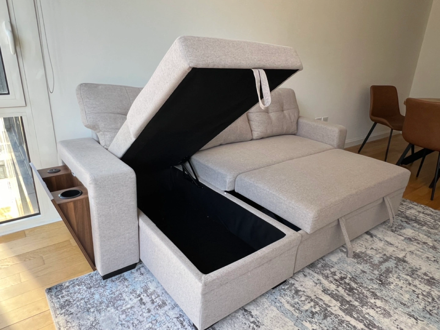 Comfortable gray fabric sectional sofa. Features a pull-out bed and storage compartments. Perfect for small spaces. Includes cup holders and USB ports