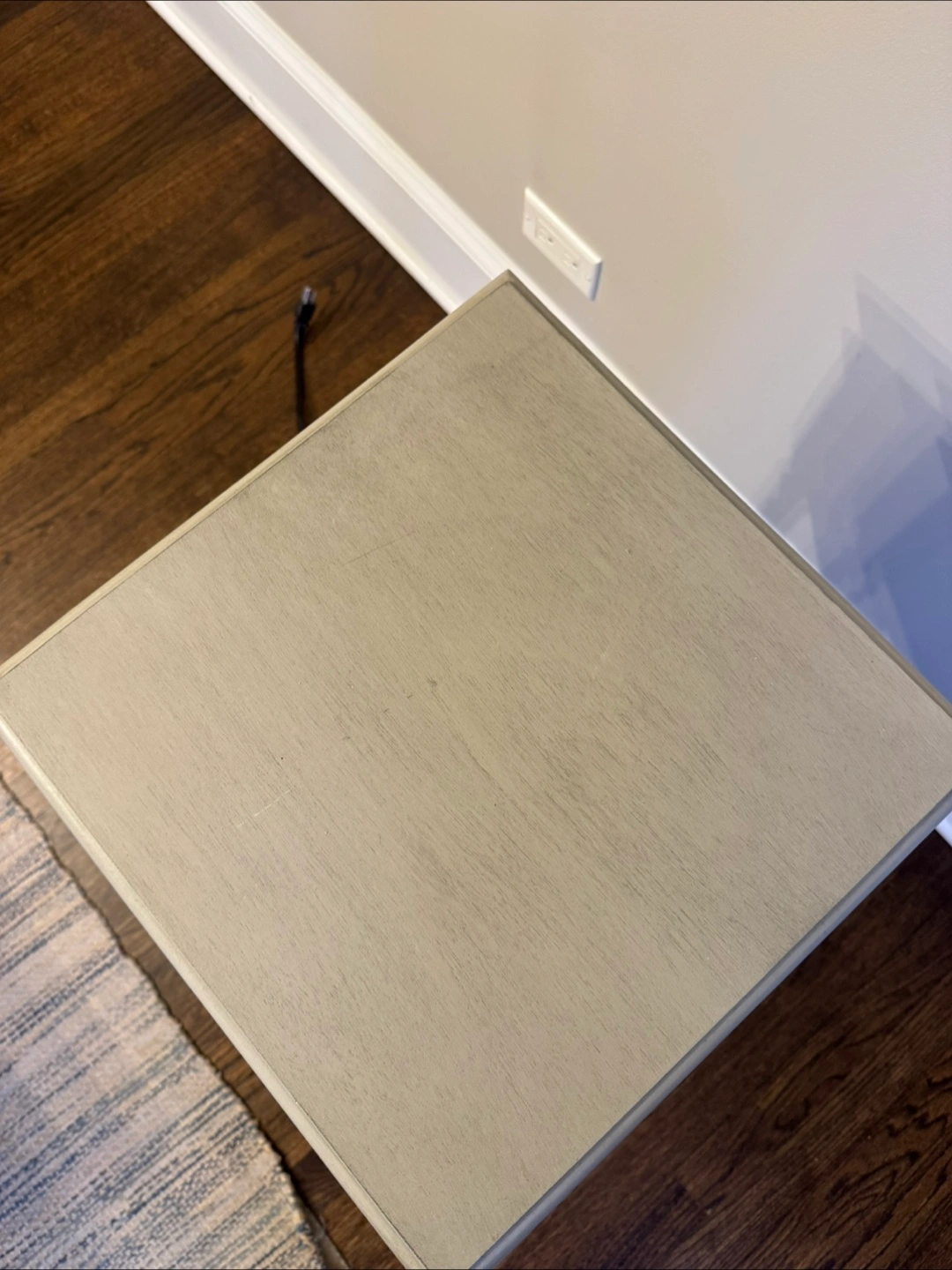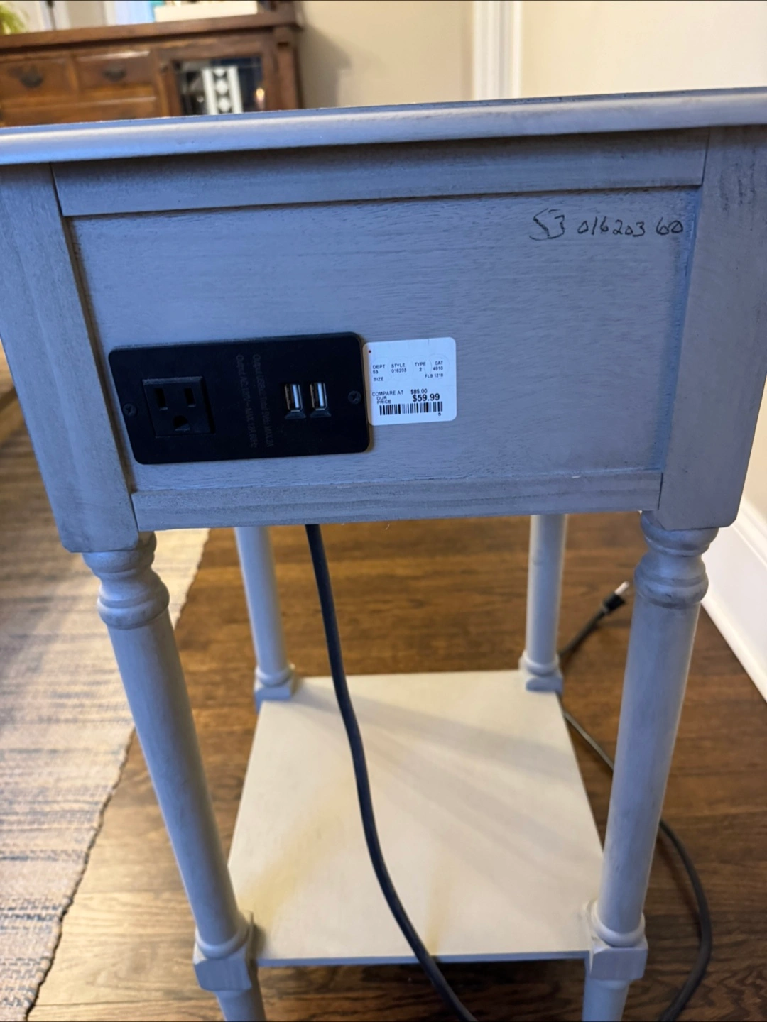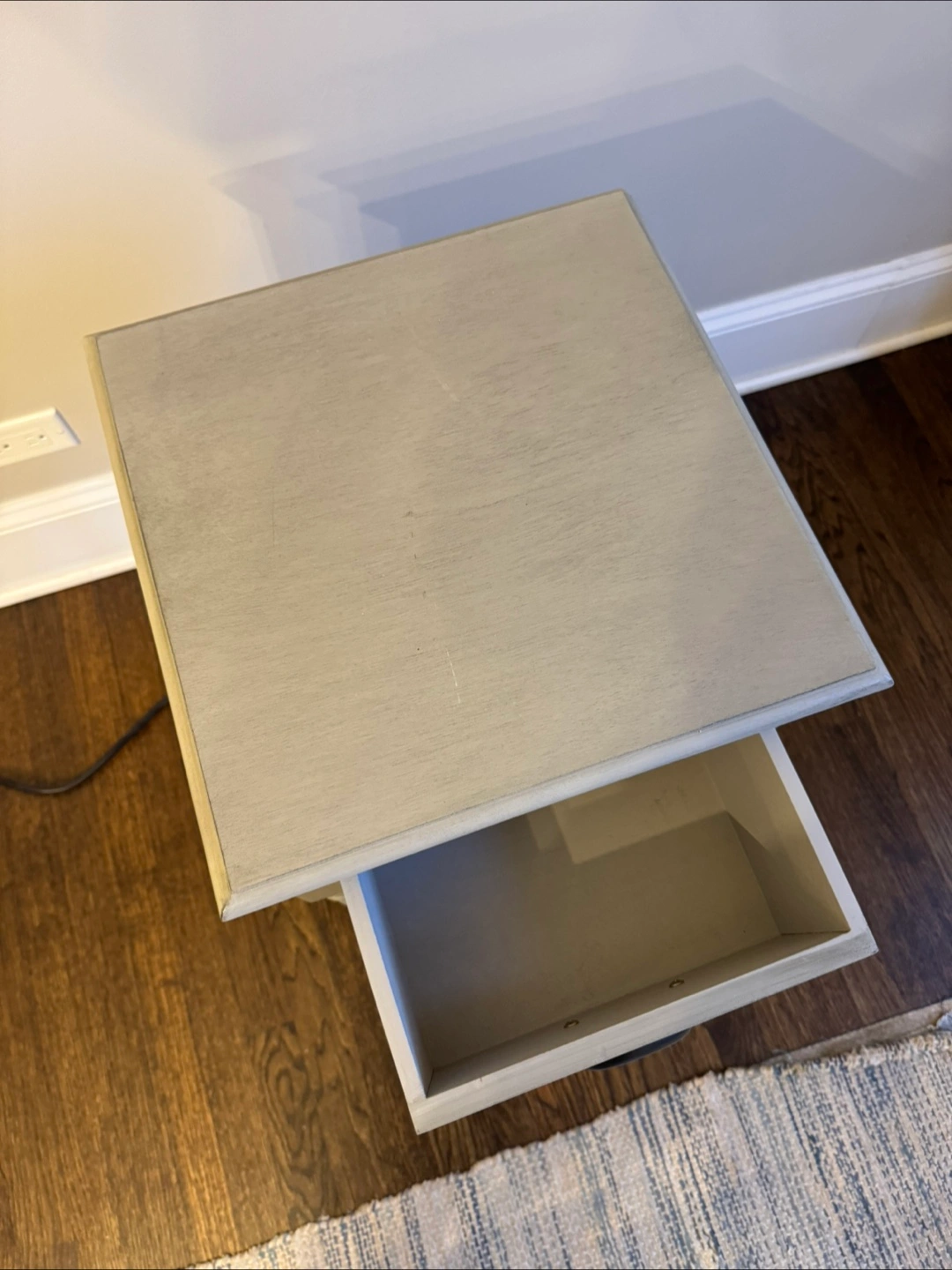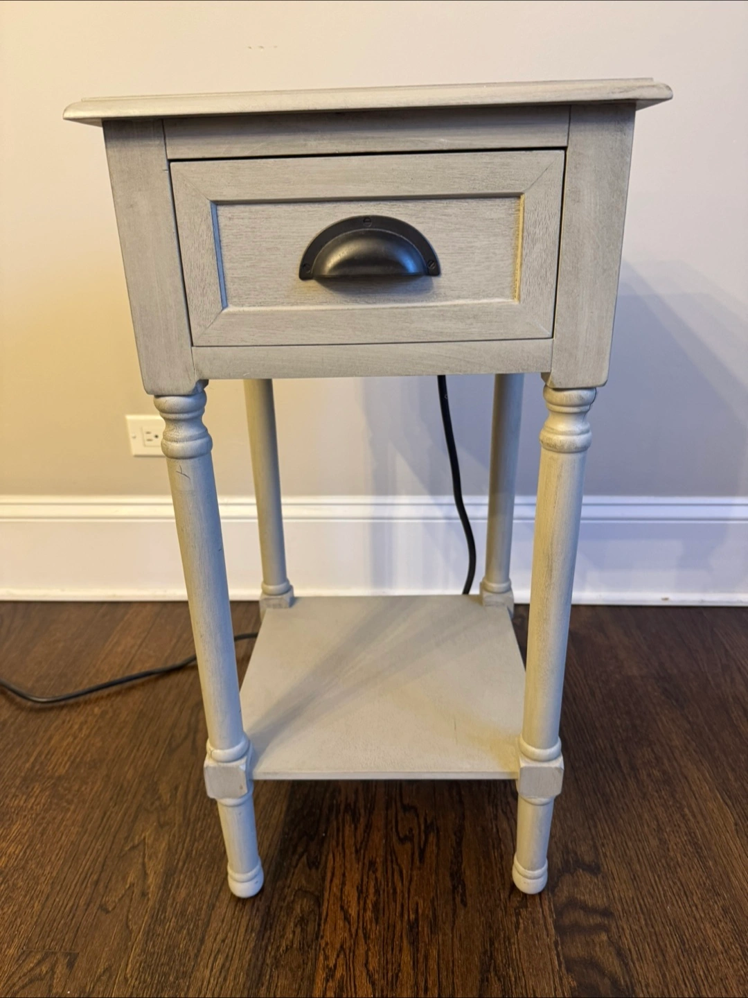 Side table, featuring a single drawer. The table is painted a light gray color. It also has a shelf and four legs. Perfect for creating a soothing reading nook. Includes electrical charging port.