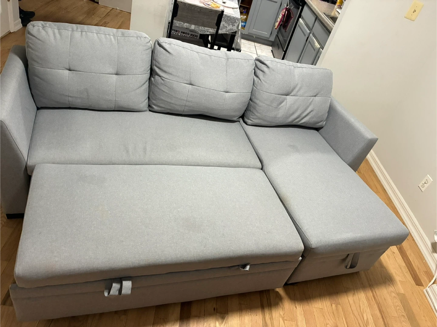 Selling a comfy gray sleeper sofa! It features a pull-out bed and convenient storage underneath the chaise. Perfect for guests or small spaces. The sofa is in great condition and ready for a new home!