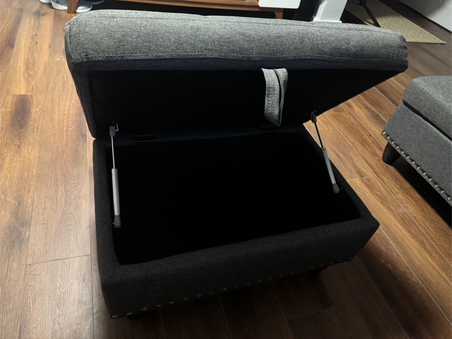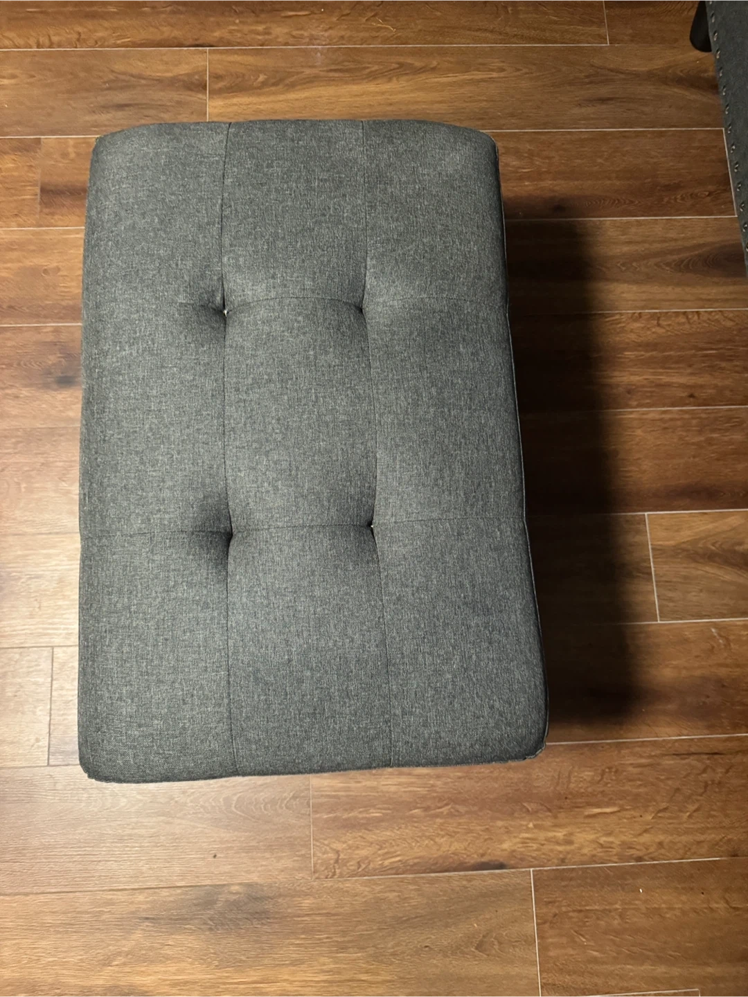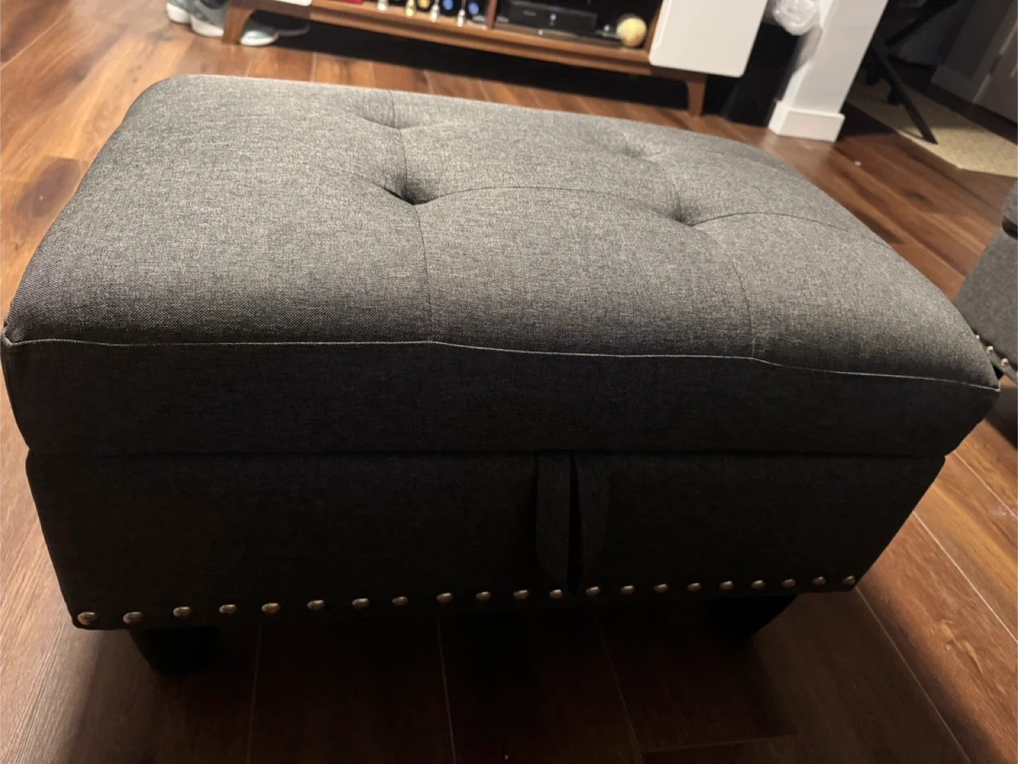 Here's a gray storage ottoman. It's in great condition and ready to be used in your home! It's perfect for storing blankets, pillows, or anything else you need to keep out of sight. The top is tufted with buttons, and there's a good amount of space inside
