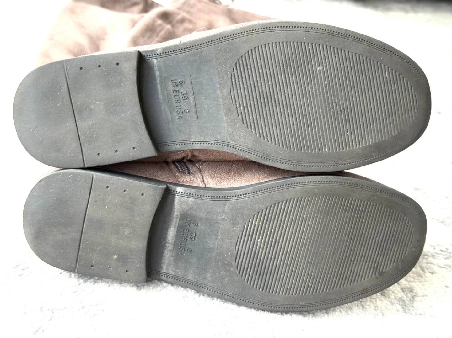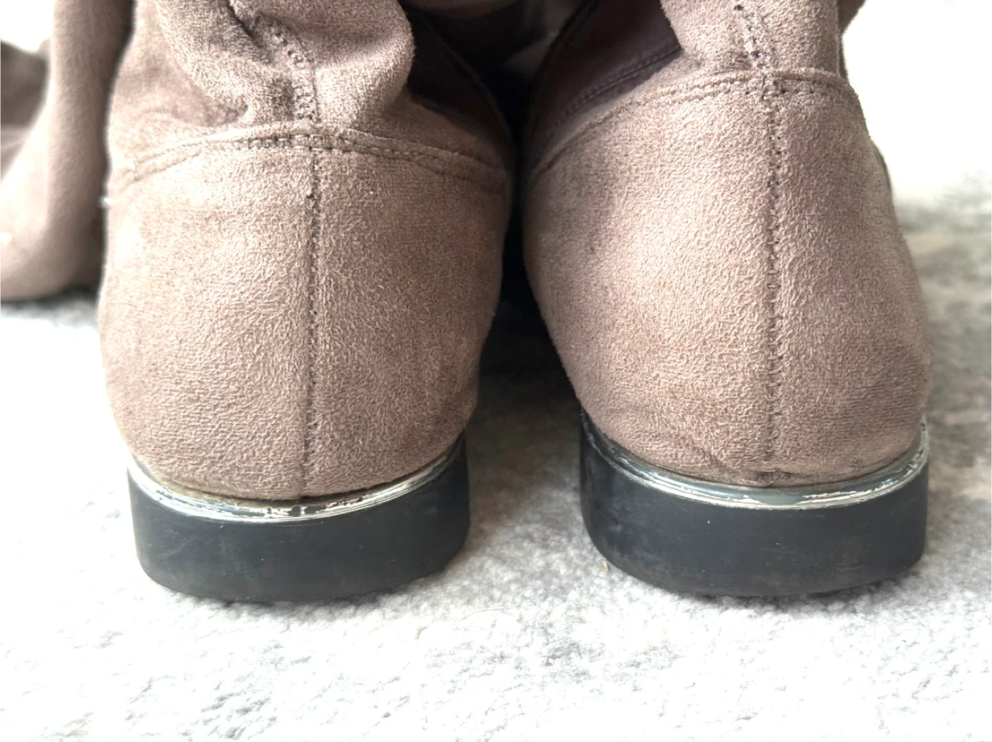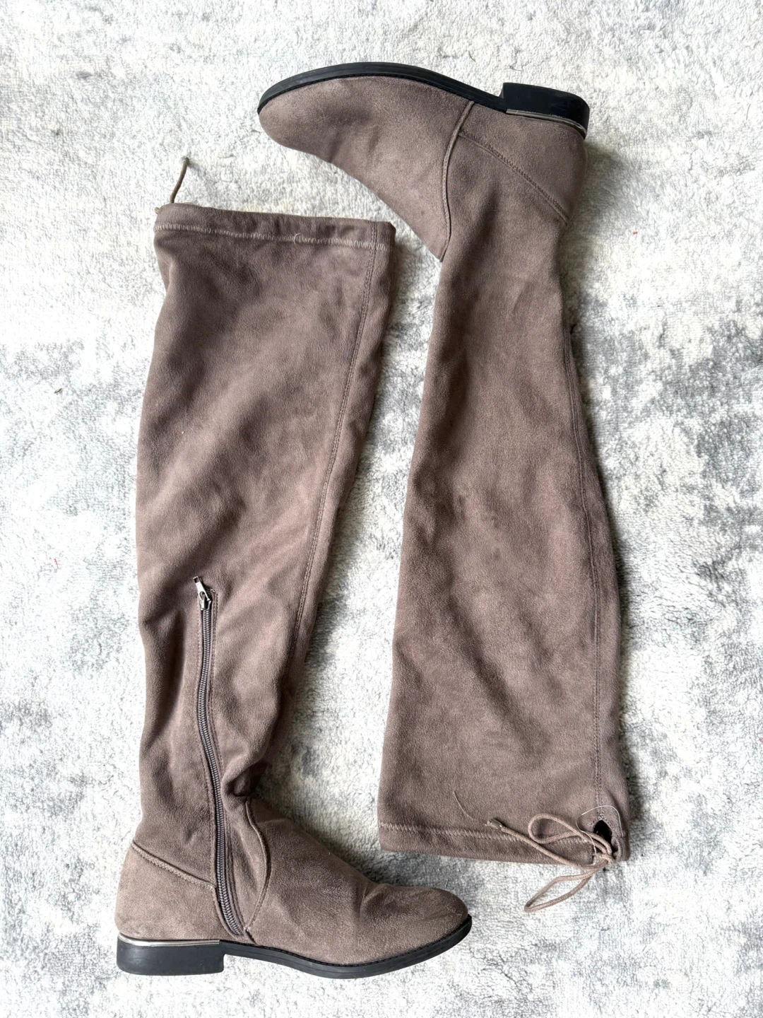78These taupe over-the-knee boots are in great condition and ready for a new home! They feature a comfortable, stretchy material and a stylish design that will elevate any outfit. Perfect for fall and winter! Size: UK 6, EUR 39, USA 8 22 inches long from sole to top