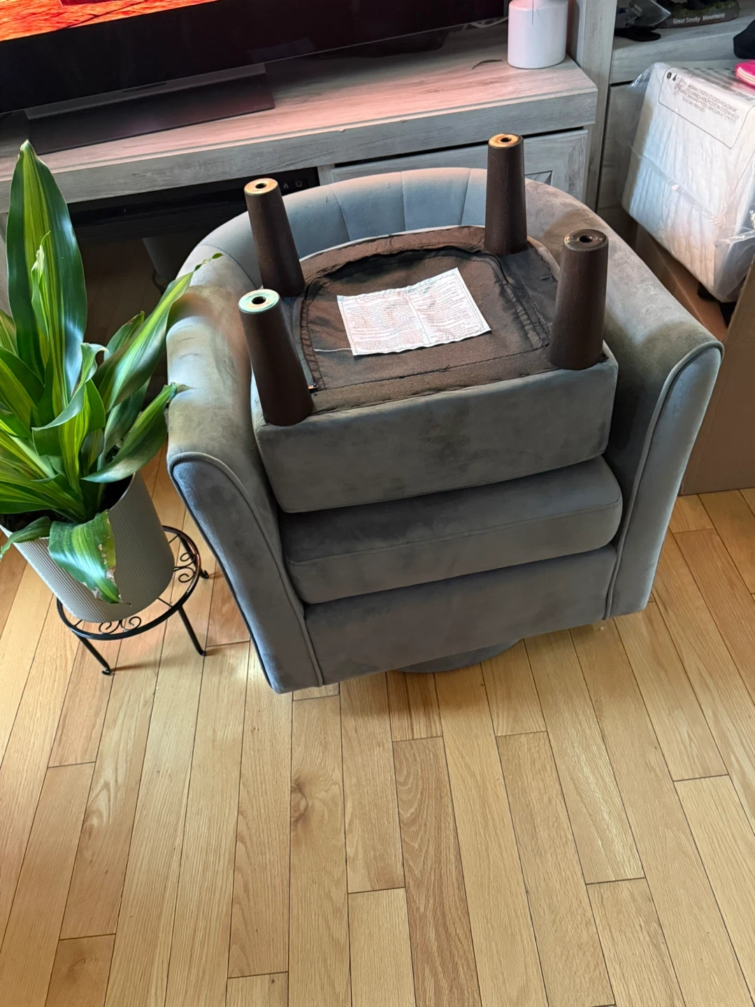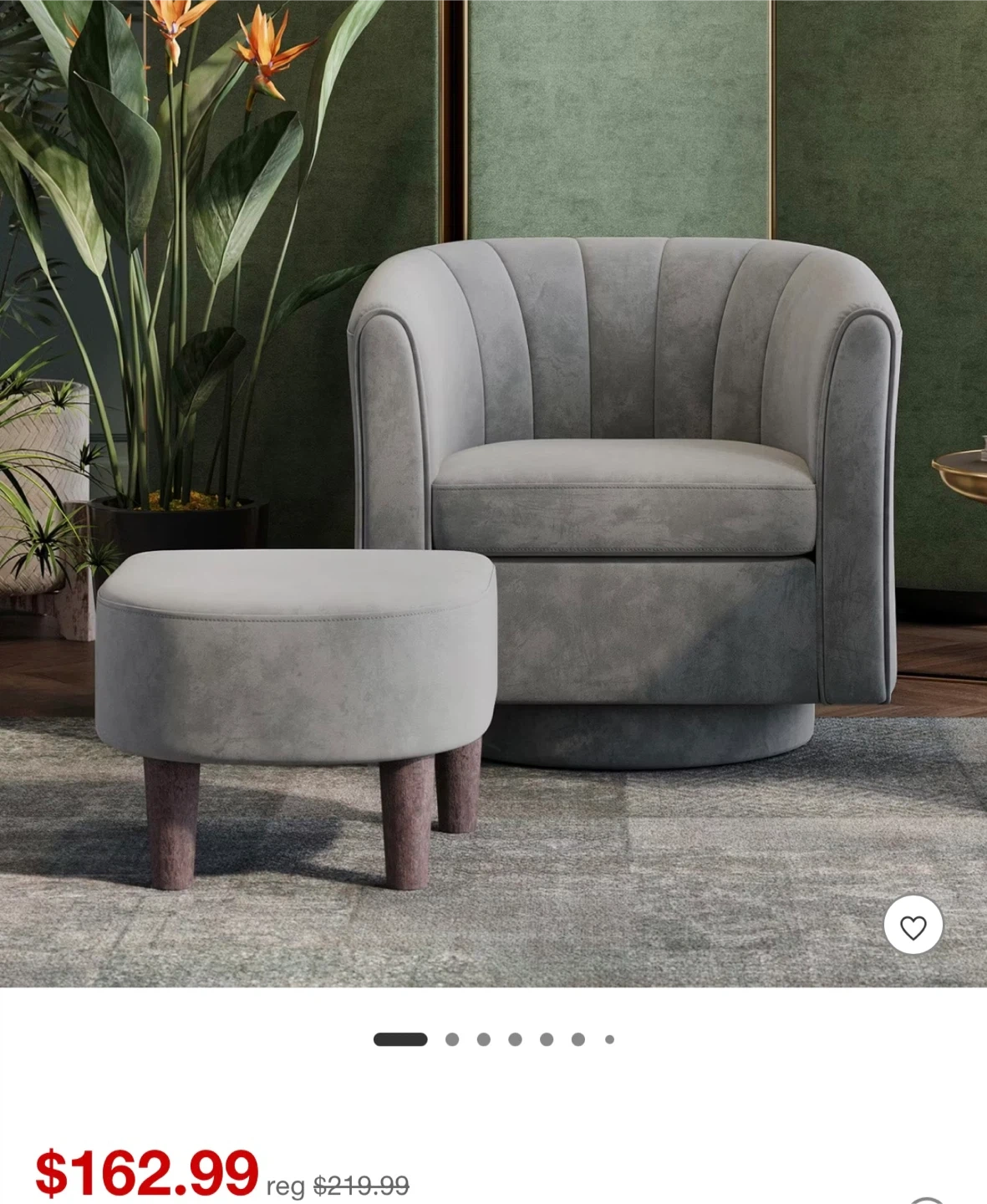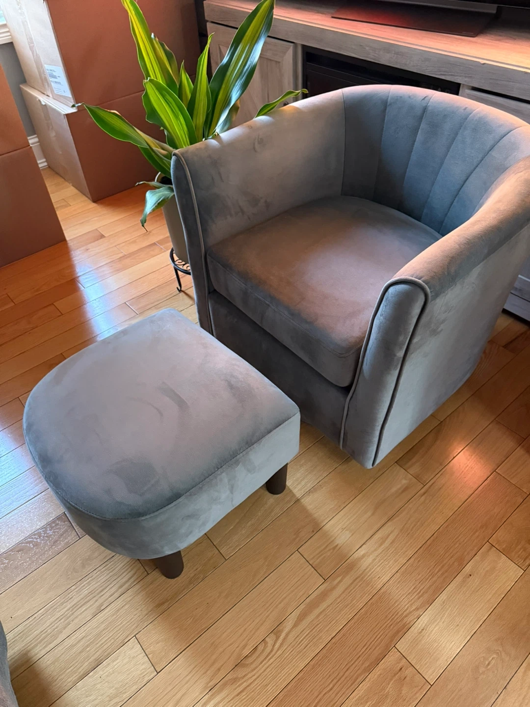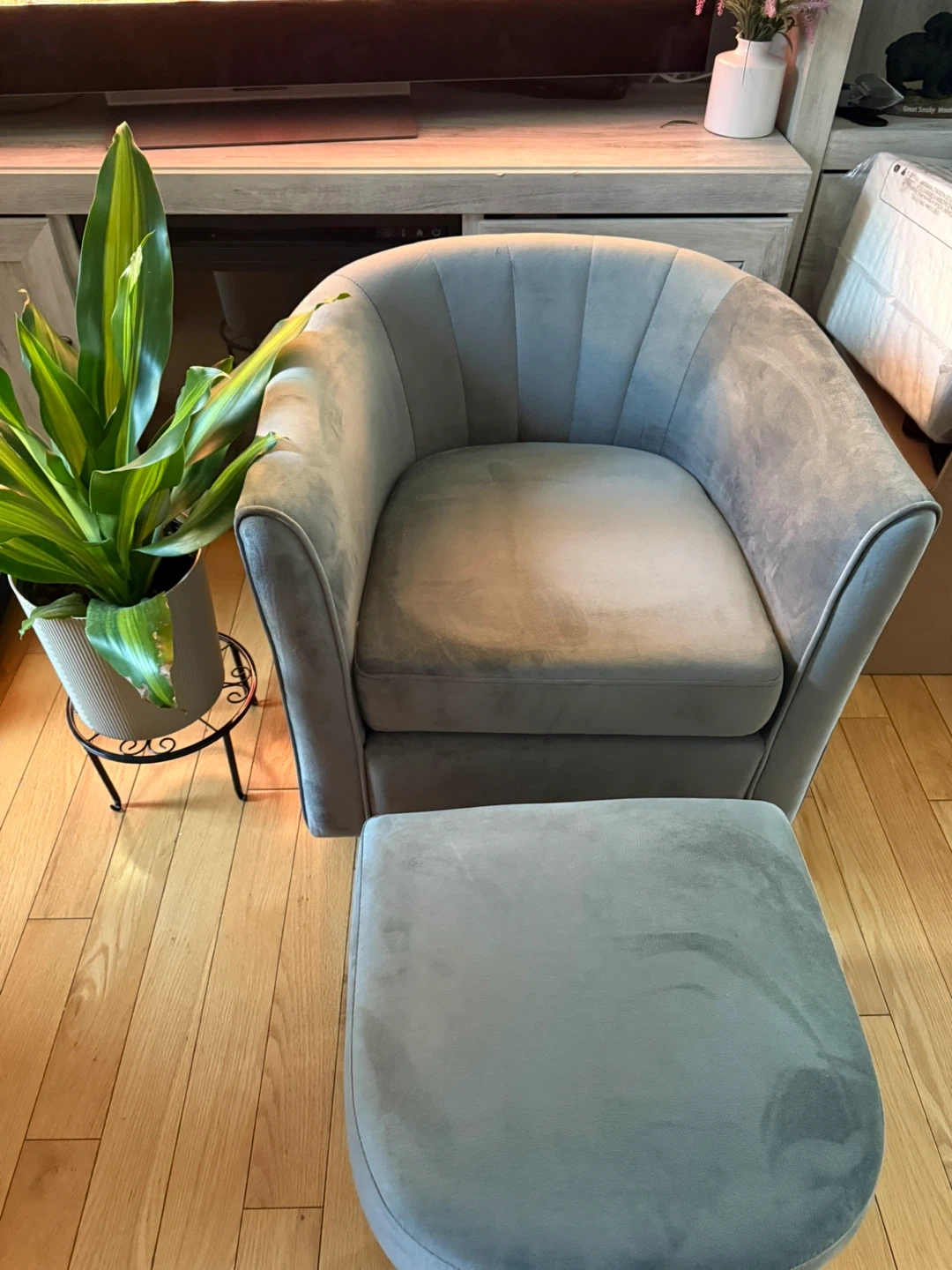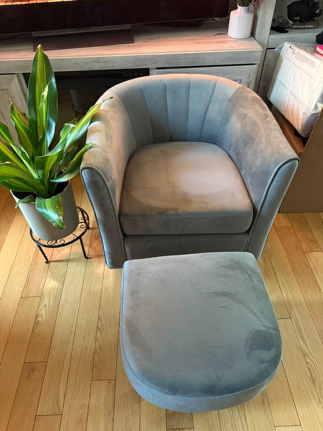 Selling a comfy gray swivel barrel accent chair with a matching ottoman! It's in great shape and would be perfect for a reading nook or living room. The chair swivels smoothly, and the ottoman adds extra comfort. Originally bought for $162.99