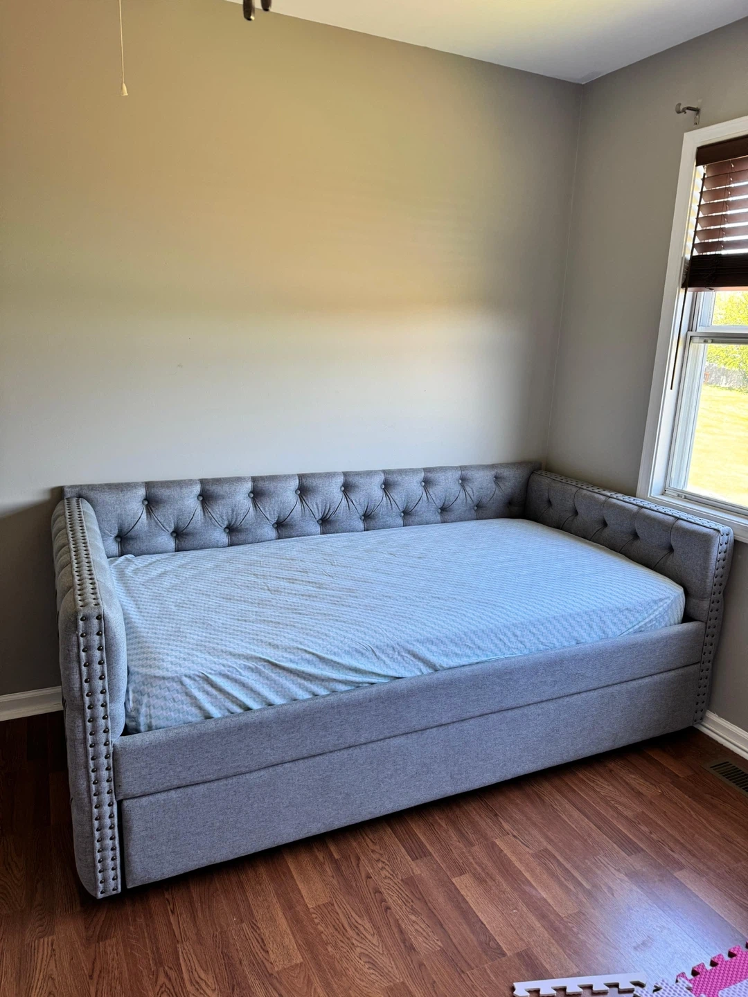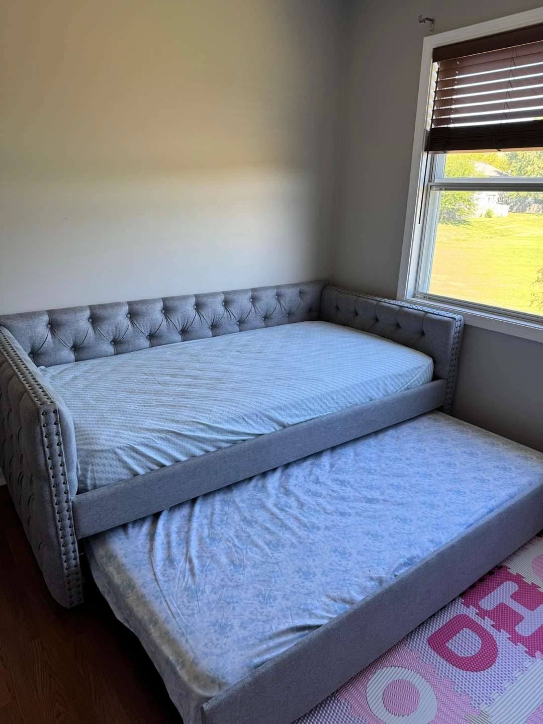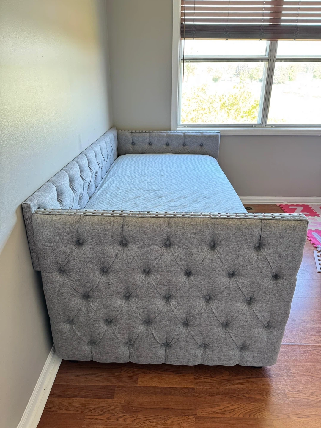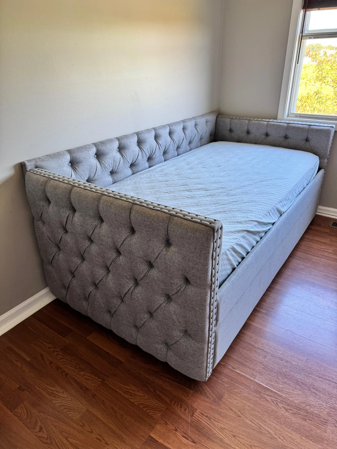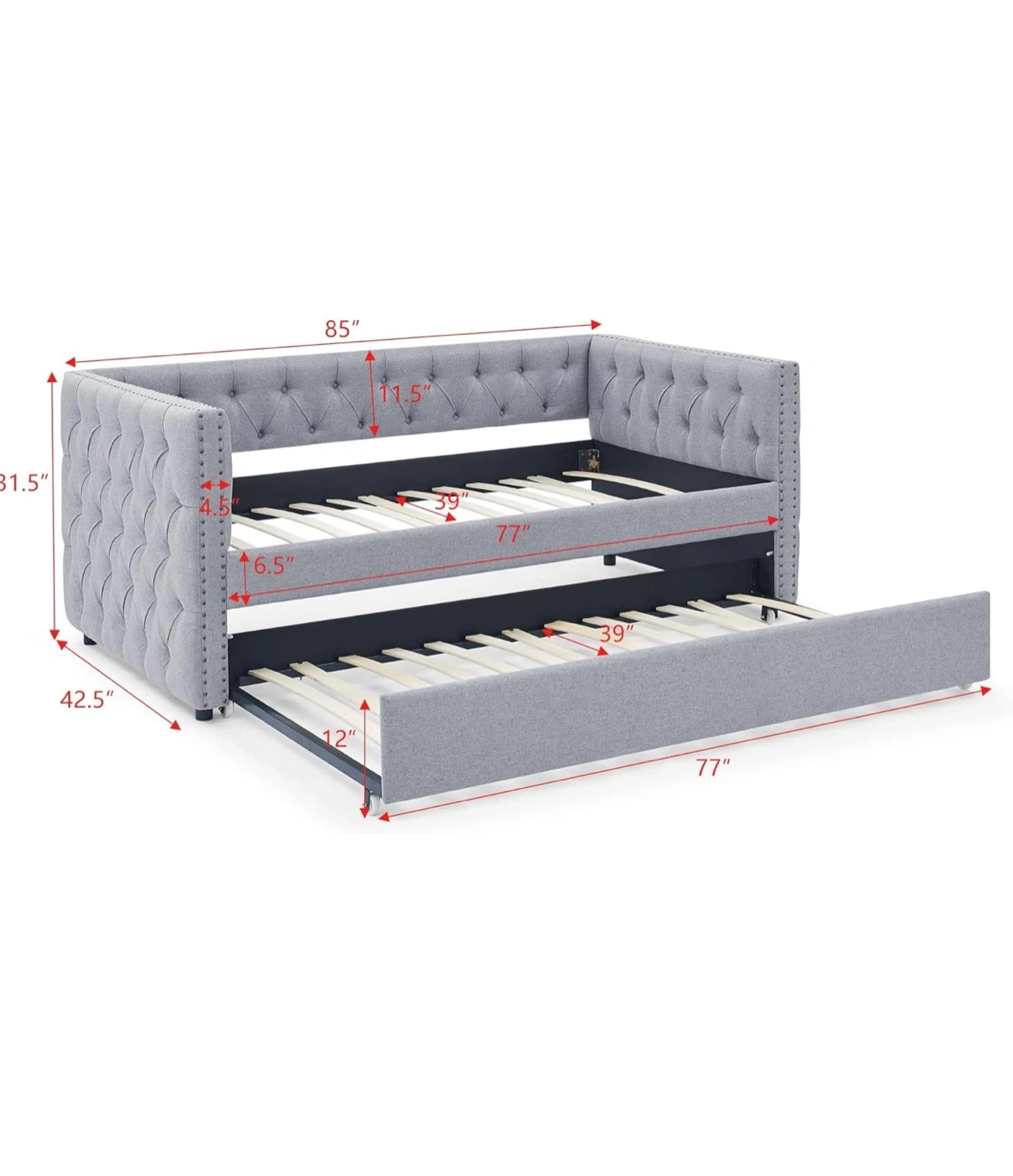 10Selling upholstered twin-size sofa bed with trundle. • Only 4 months of use, in excellent condition. • Elegant gray upholstery with tufted buttons and decorative nailhead trim on square arms. • Solid wood frame for extra durability. • Includes a pull-out trundle bed — perfect for guests or small spaces. 📏 Approximate measurements: • Length: 85” • Depth: 42.5” • Back height: 31.5” • Bed and trundle length: 77” • Mattress width: 39” ✅ Condition: Used, very well maintained, no stains or damage. 💰 Price: $430 with mattresses (The mattresses are brand new)