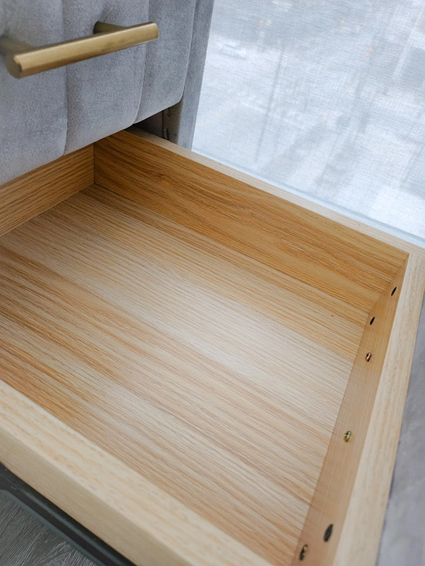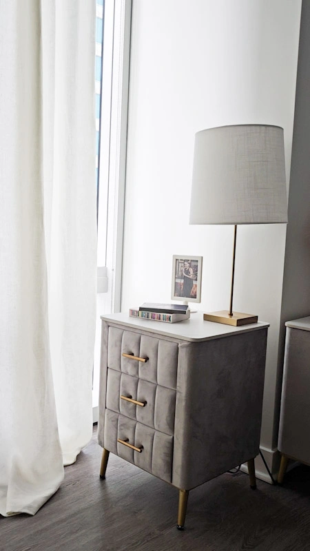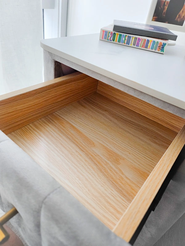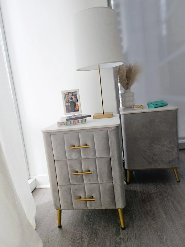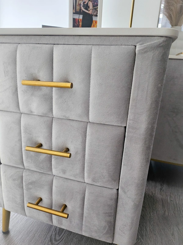 Selling a set of lovely gray side tables! They have a soft, velvety texture and stylish gold handles. The top has a marble-like design but is made of a durable stone that doesn't discolor. Each one has 3 drawers made of light-colored wood. It's in great condition and would look great in any bedroom or living space. Please Note: You will need to be able to pick up. There is no delivery.