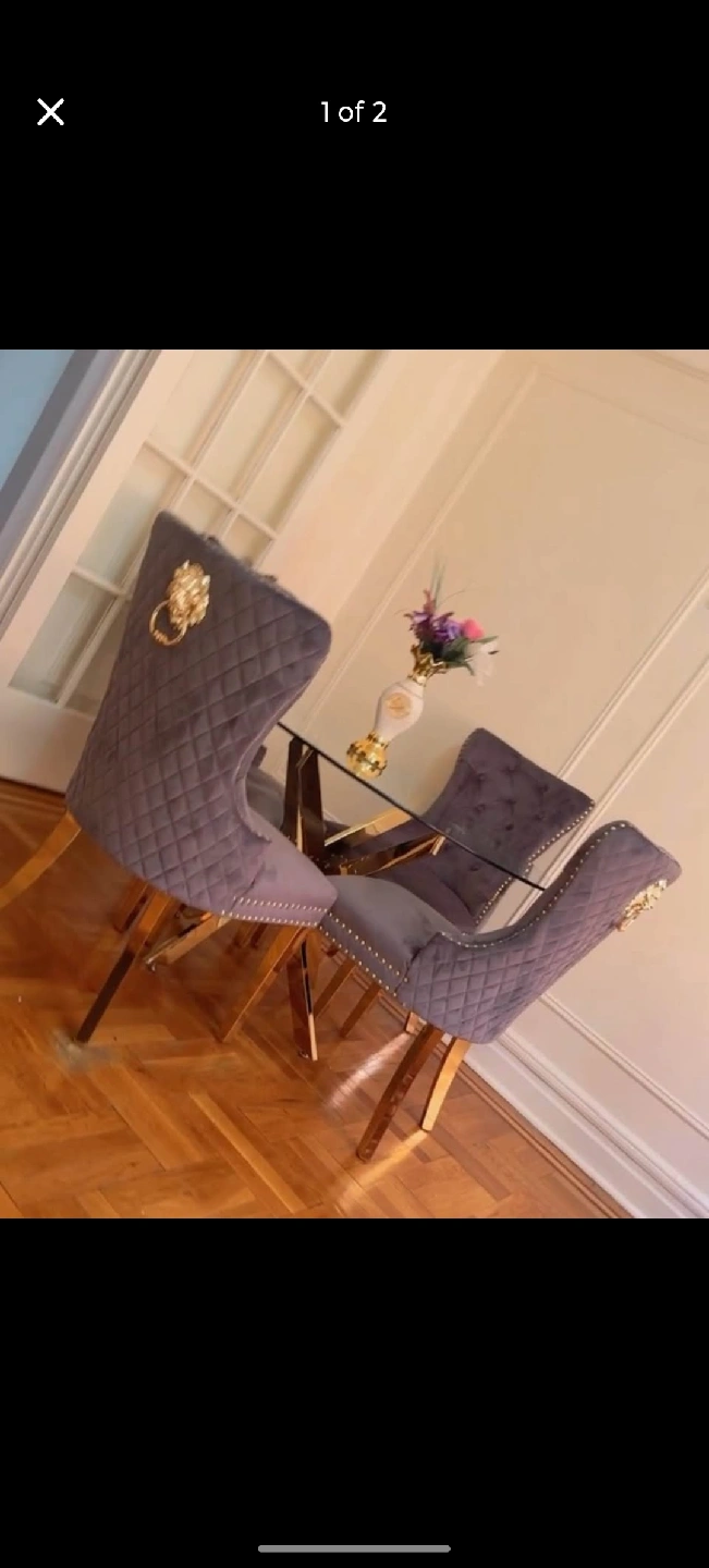 Selling a set of stylish gray velvet dining chairs! They feature a quilted design and unique gold lion accents on the back. The chairs have gold legs and would make a great addition to any dining room