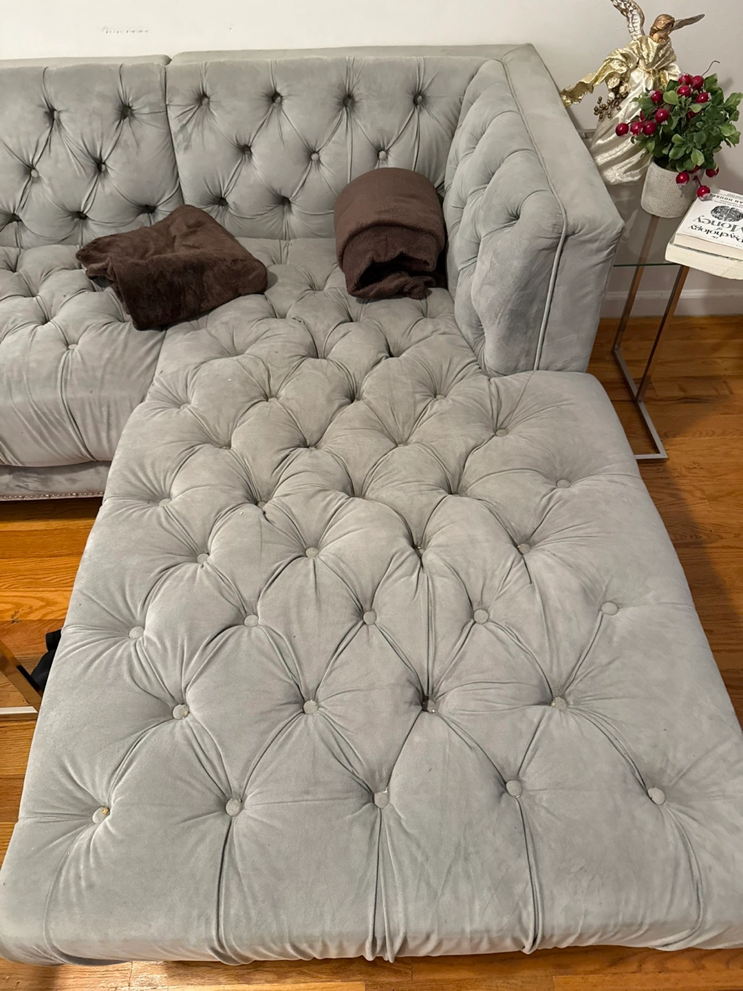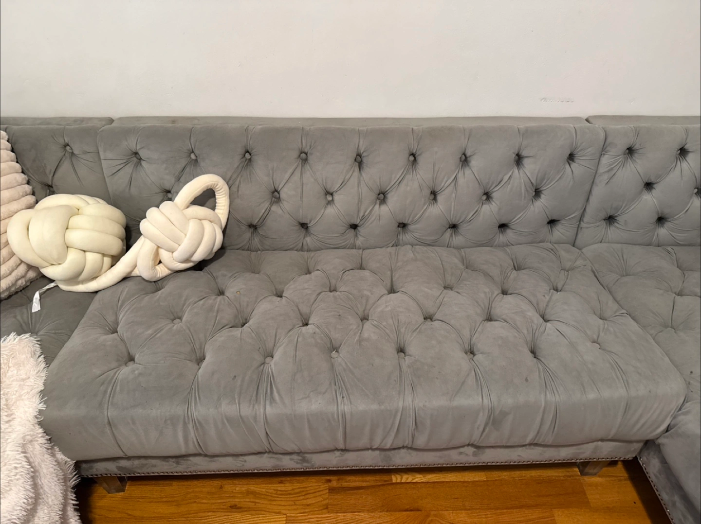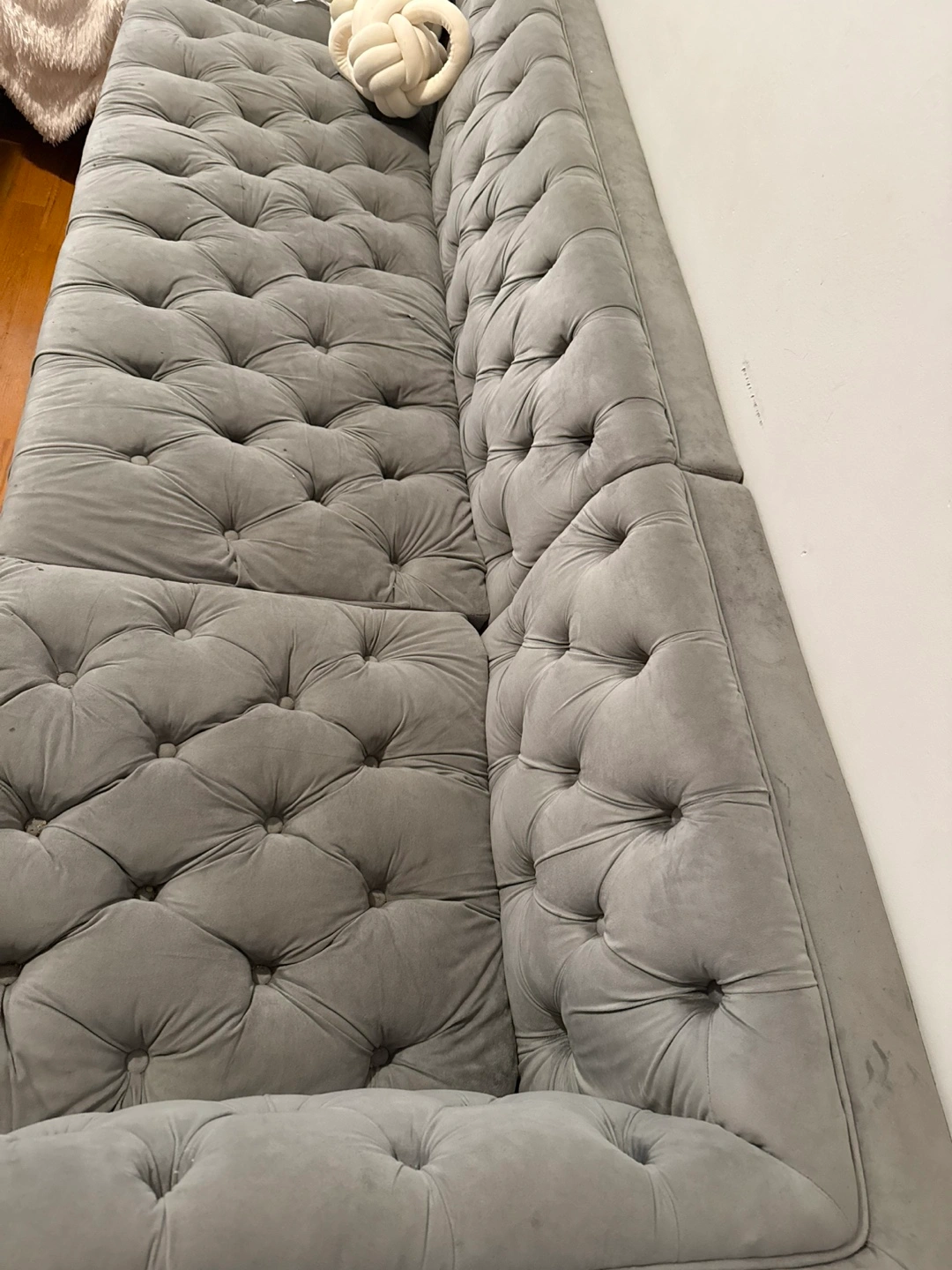 Gray velvet sectional sofa. Button tufted design. Features wooden legs. Some minor wear.