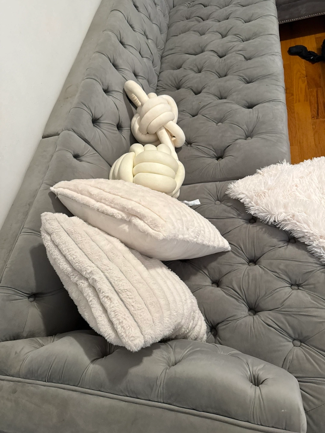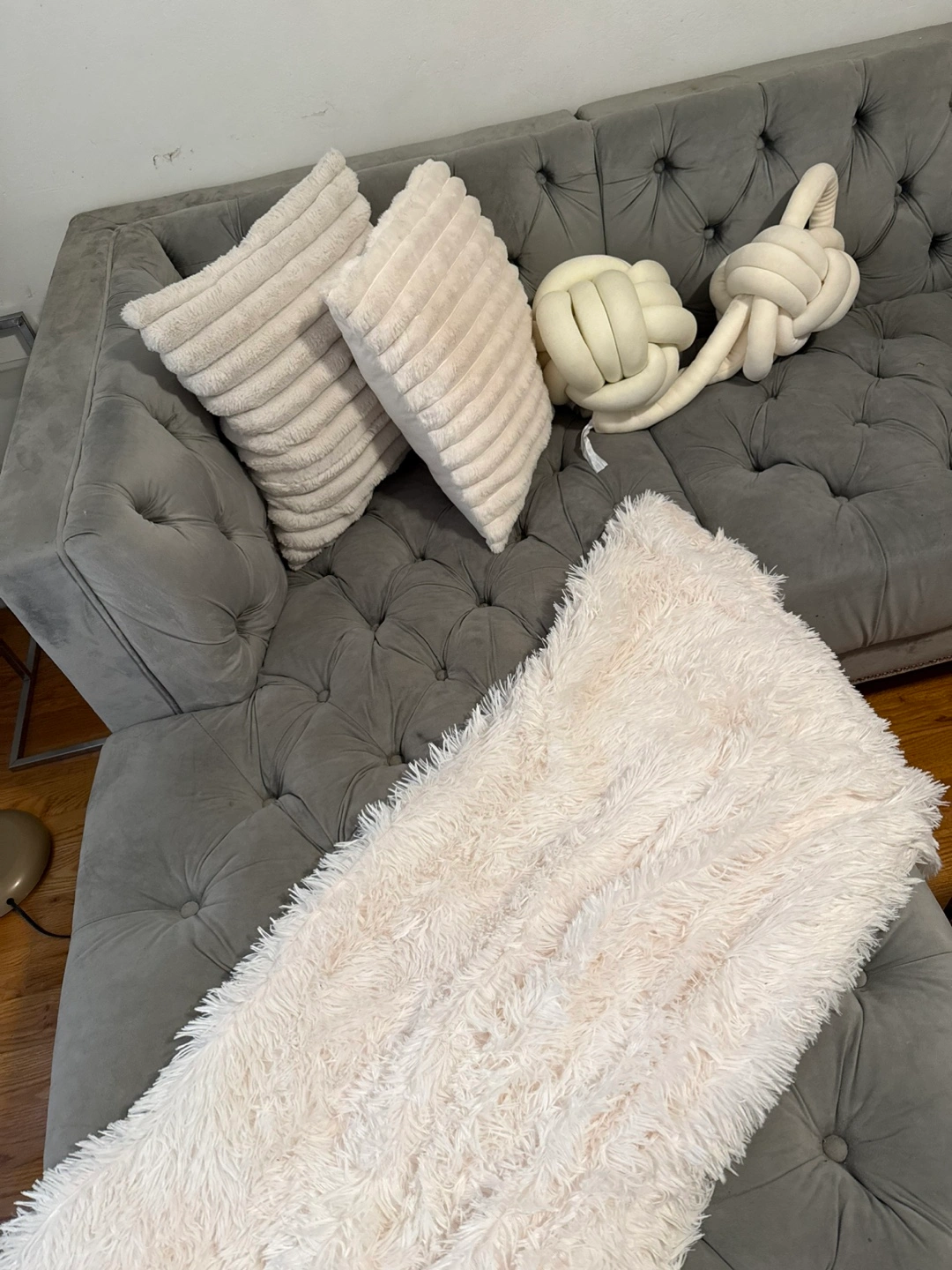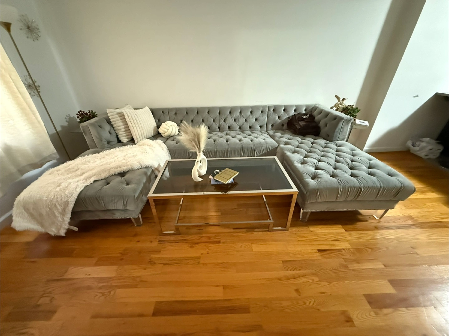 Gray velvet sectional sofa. Button tufted design. Features wooden legs. Some minor wear.