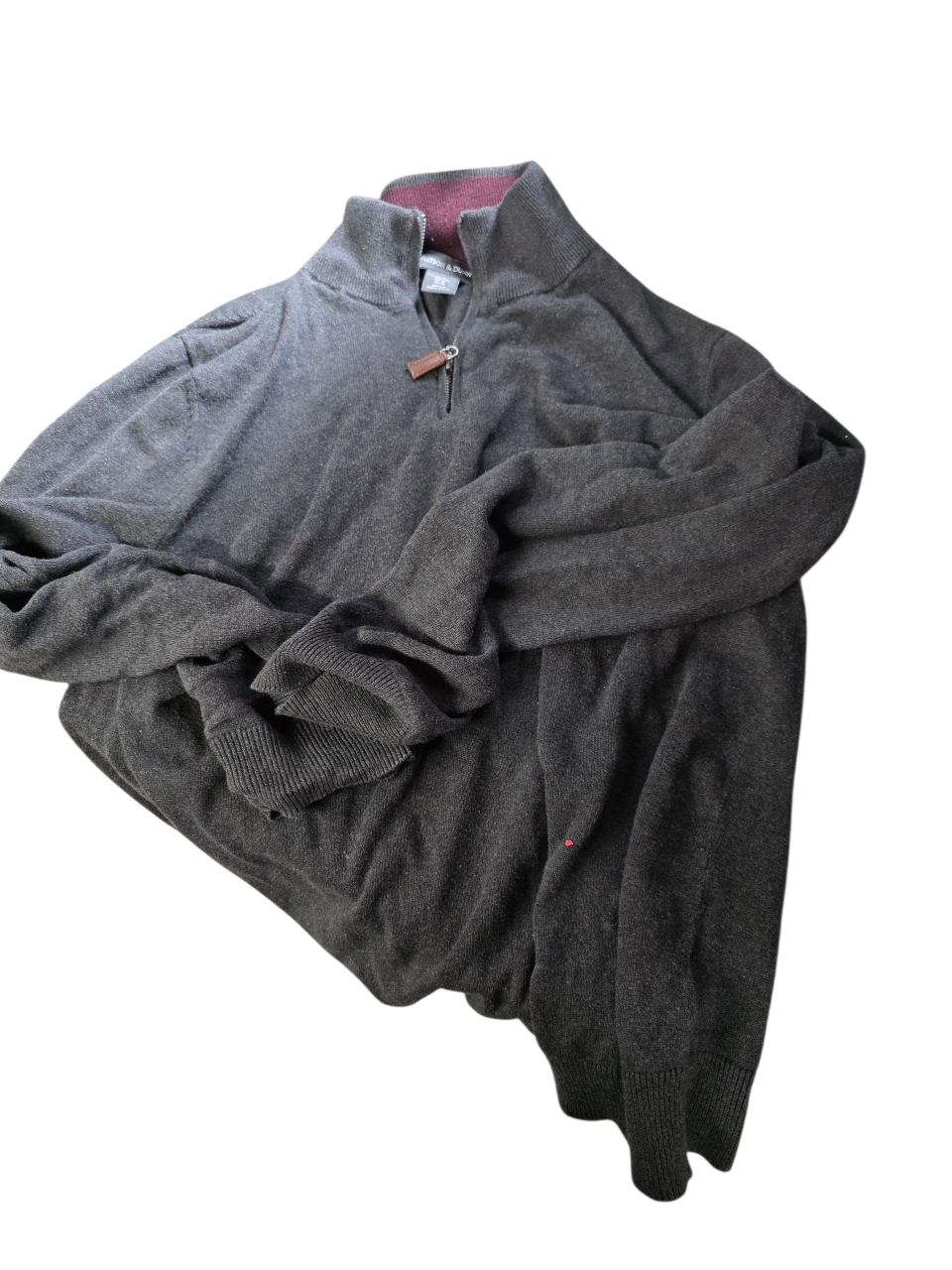 (thrifty item)Selling a Watson & Dunn quarter-zip sweater in size 2XL. It's a stylish and comfortable piece, perfect for layering or wearing on its own. The sweater is a versatile gray color that goes well with anything. It features a quarter-zip design with a leather zipper pull. A small logo is embroidered near the hem.