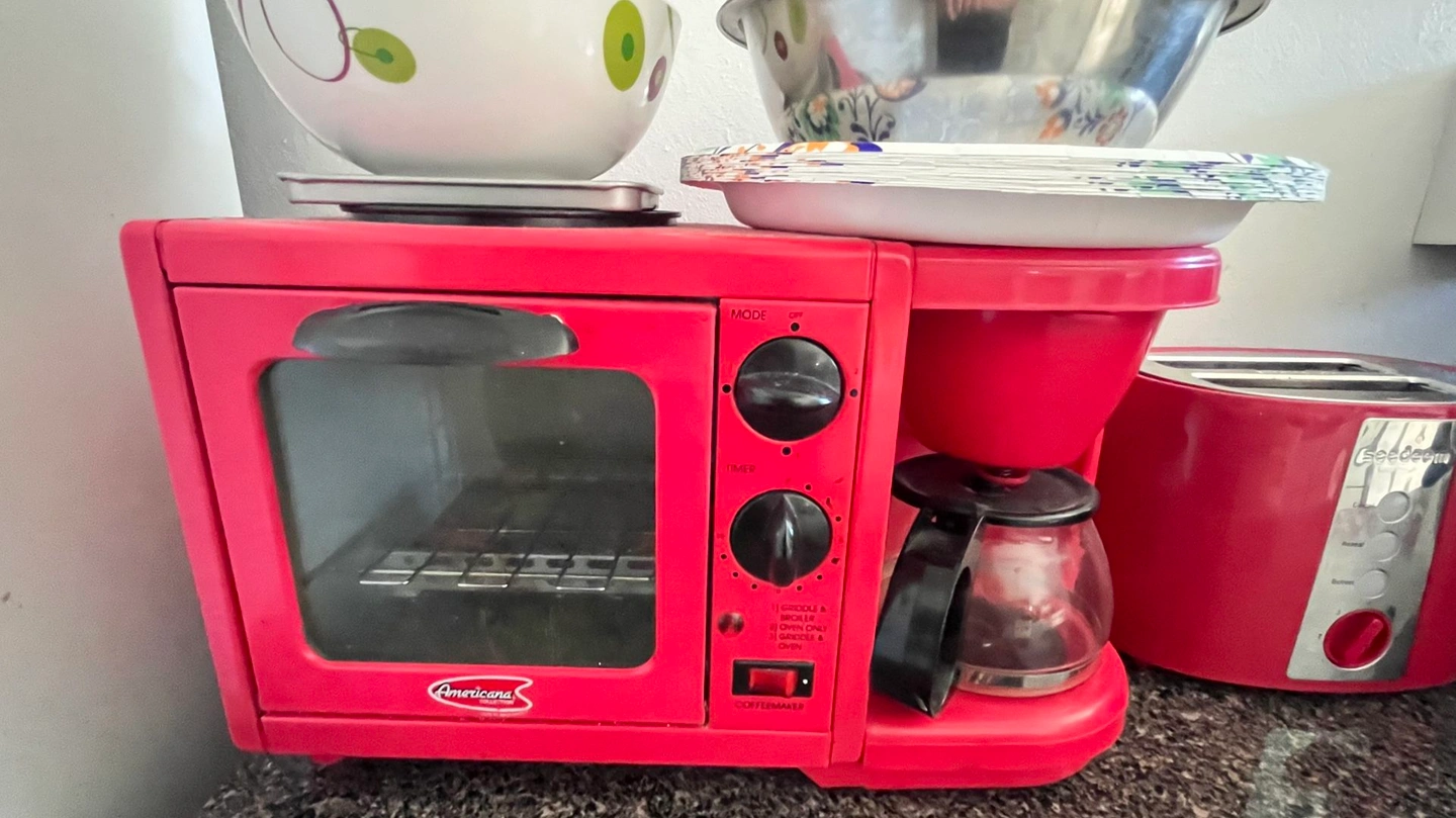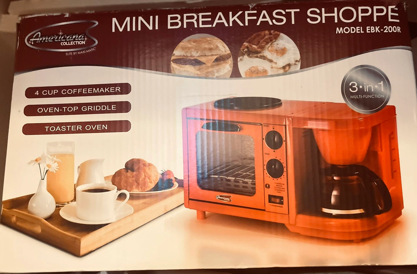 Americana by Elite Mini Breakfast Shoppe, model EBK-200R, which is a 3-in-1 multifunction breakfast station. It includes a 4-cup coffeemaker, a toaster oven, and an oven-top griddle. This compact appliance is designed to make a complete breakfast at once, saving counter space and energy. It is suitable for small kitchens, dorms, and apartments. Brand: Americana by Elite.