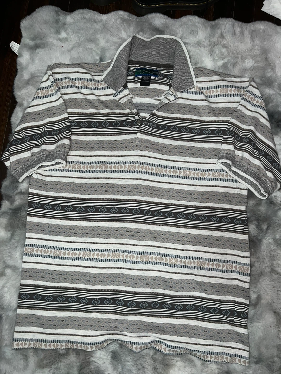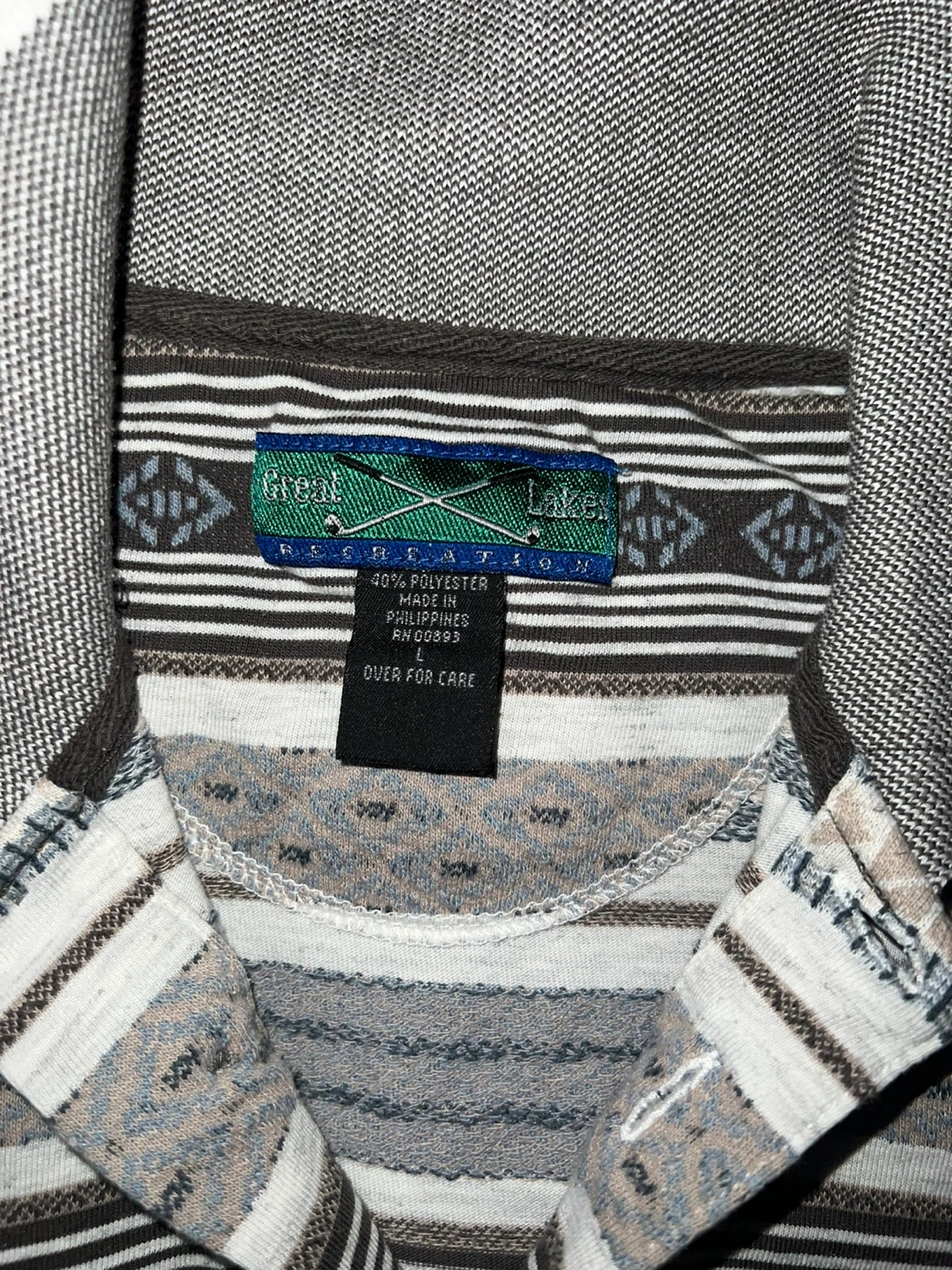 Here's a stylish Great Lakes polo shirt for men. It features a unique striped pattern in shades of gray, white, and brown. The material is 60% cotton and 40% polyester, making it comfortable and easy to care for. It's in great shape and ready for a new home!