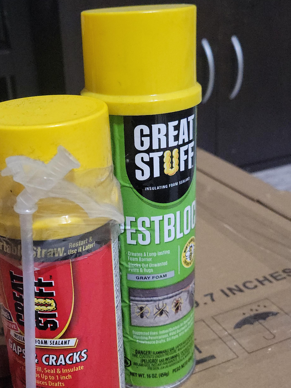 Selling two cans of Great Stuff insulating foam sealant. One is Pestblock, which creates a long-lasting foam barrier to block out unwanted pests and bugs with gray foam. Net weight is 16 oz (454g). The other can is for gaps and cracks to fill, seal, and insulate up to 1 inch and reduces drafts