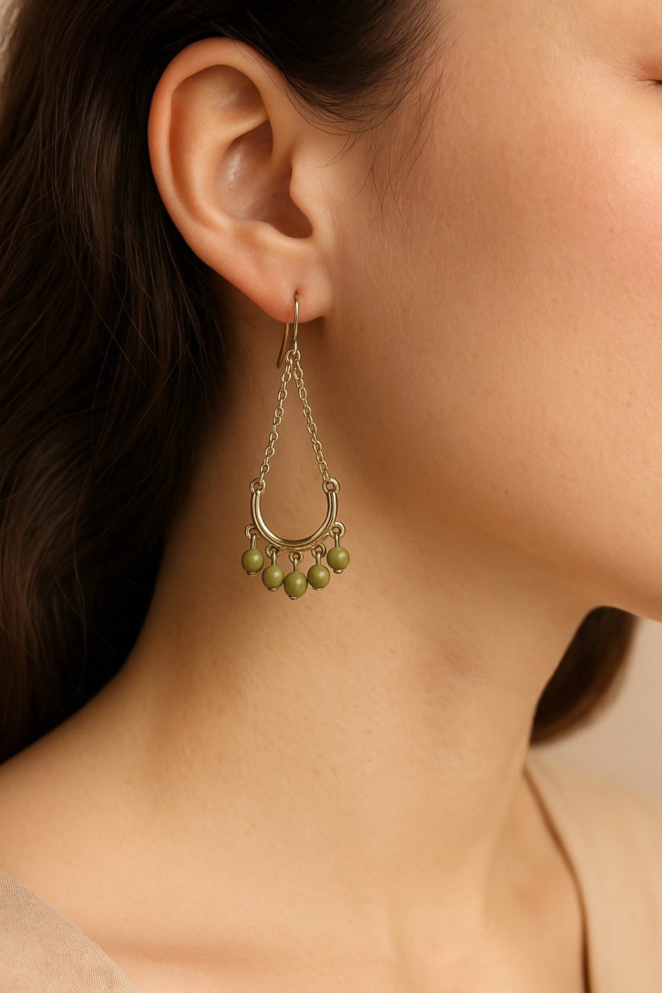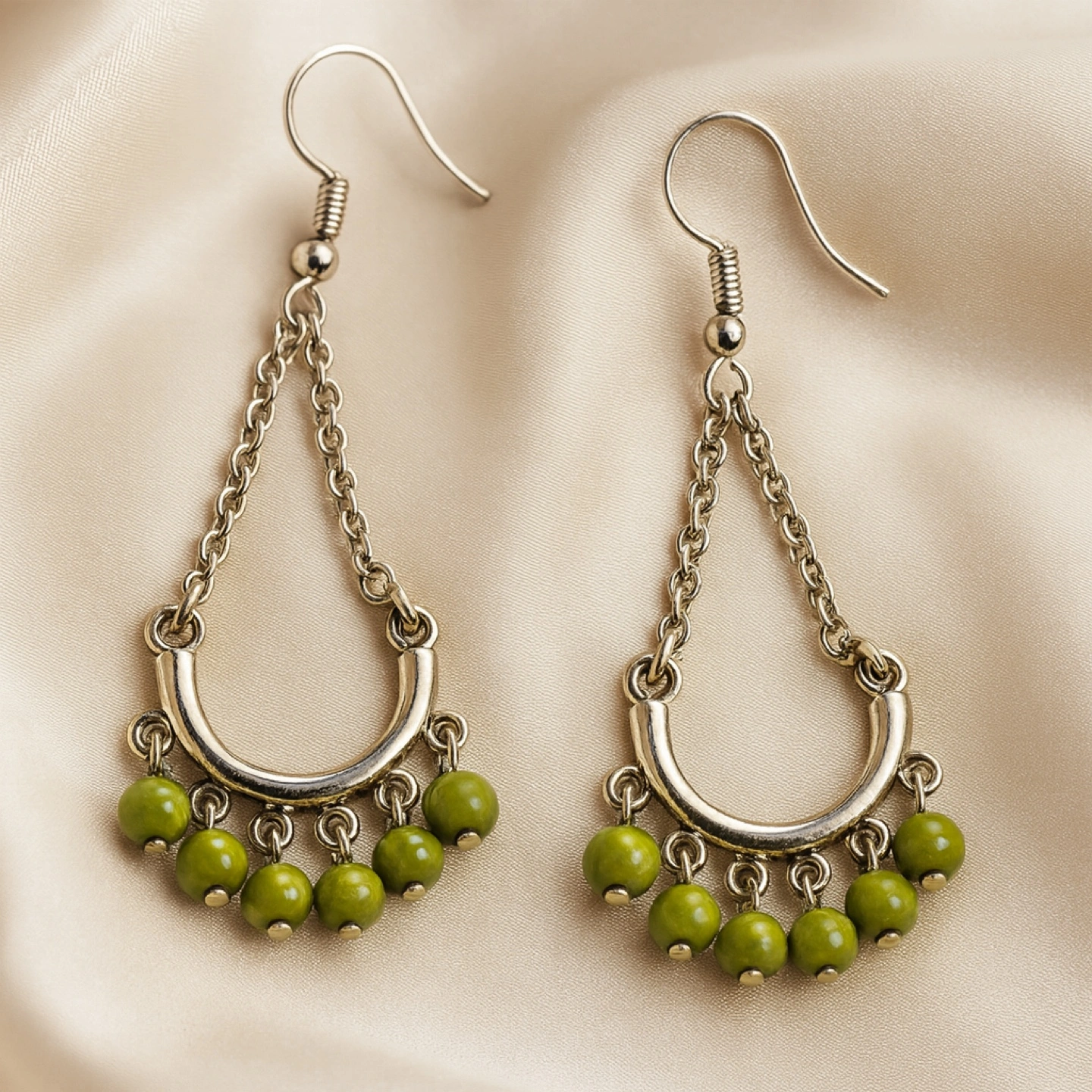 47Cute dangle earrings with green beads! They have a stood-tone finish and a unique design that will add a pop of color to any outfit